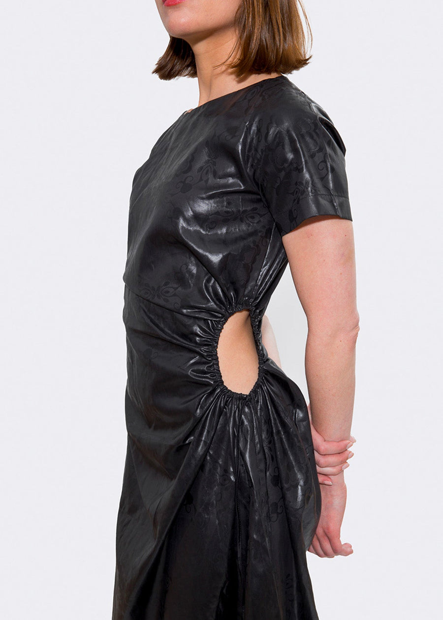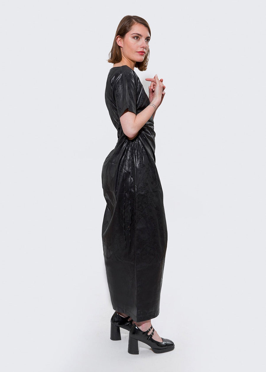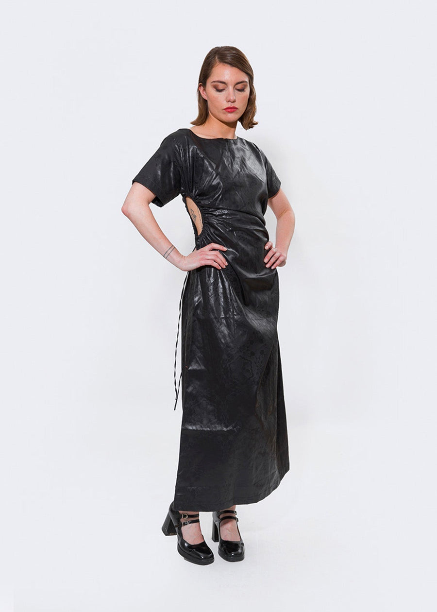 The Djarabi Bazin dress exudes sophistication with its luxurious bronze and brass buttons, complemented by stylish side openings. This dress beautifully merges traditional craftsmanship with contemporary design, making it a stunning choice for any elegant occasion.