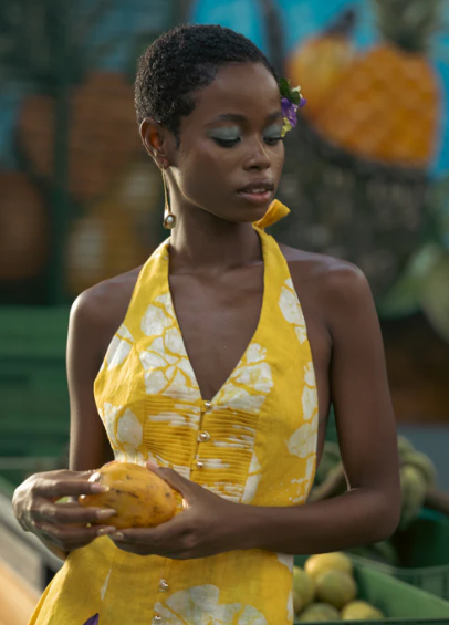 Oya Abeo Hibiscus Mademoiselle Linen Dress with Brass Buttons