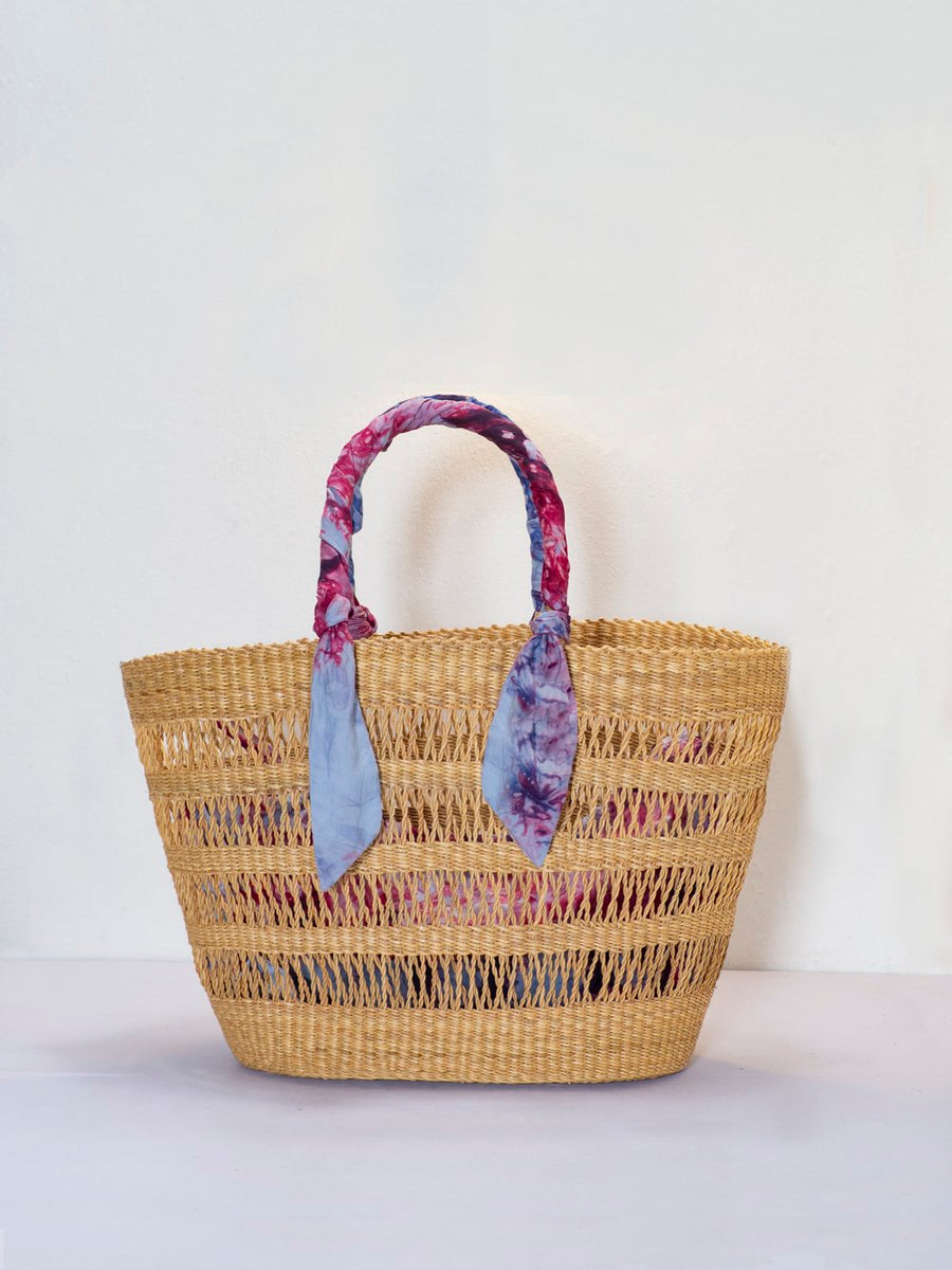 The stylish Ayine Bag embodies Aketekete's iconic design and is a perennial favorite. Crafted with natural straw and a tie and dye cotton interior, it radiates a rustic charm. Durably constructed with buttons and two detachable cloth handles, it's spacious enough to store your essentials and more. Plus, its drawstring closure adds security. Each bag is handmade, making it unique with variations of color, pattern, size, and shape. Aketekete is proud to partner with weaving communities and dyers in Ghana to sustainably preserve this cherished craft. By choosing Aketekete, you support Ghanaian culture and celebrate the beauty of individuality.