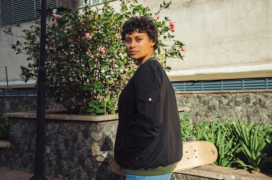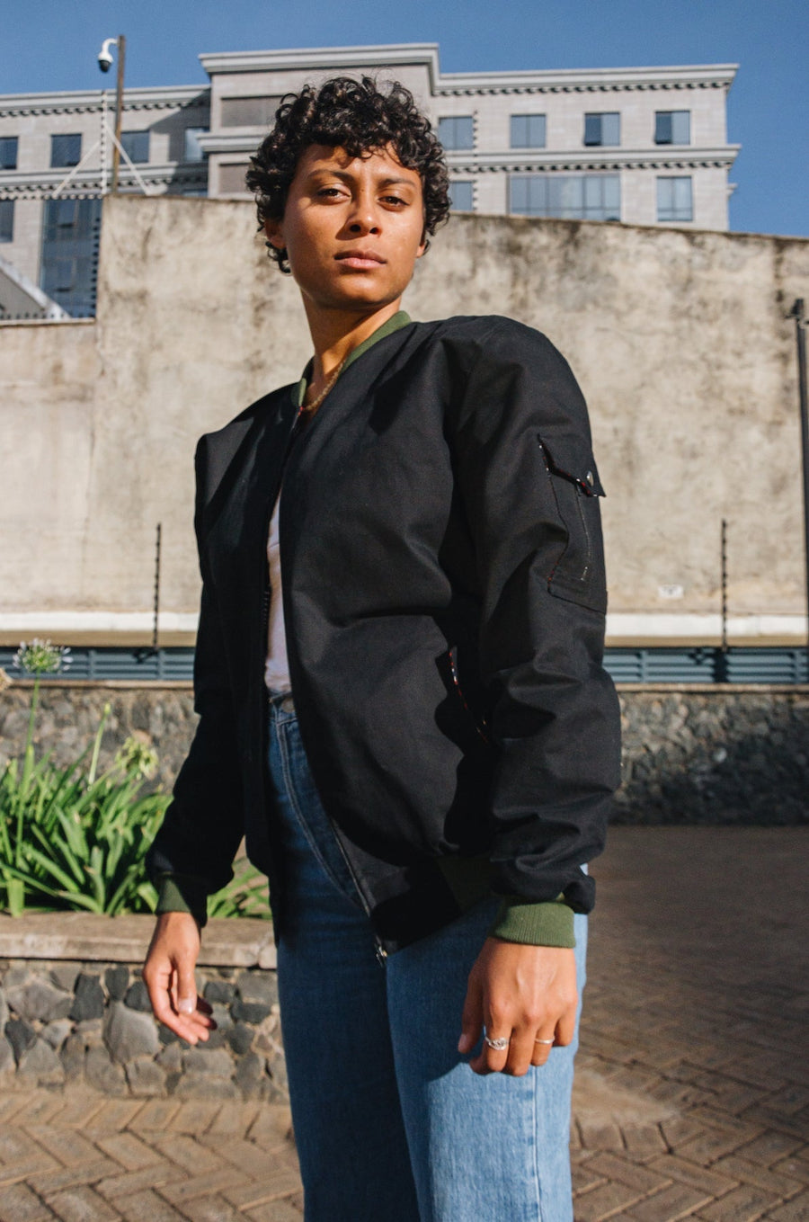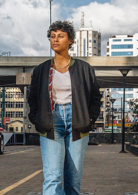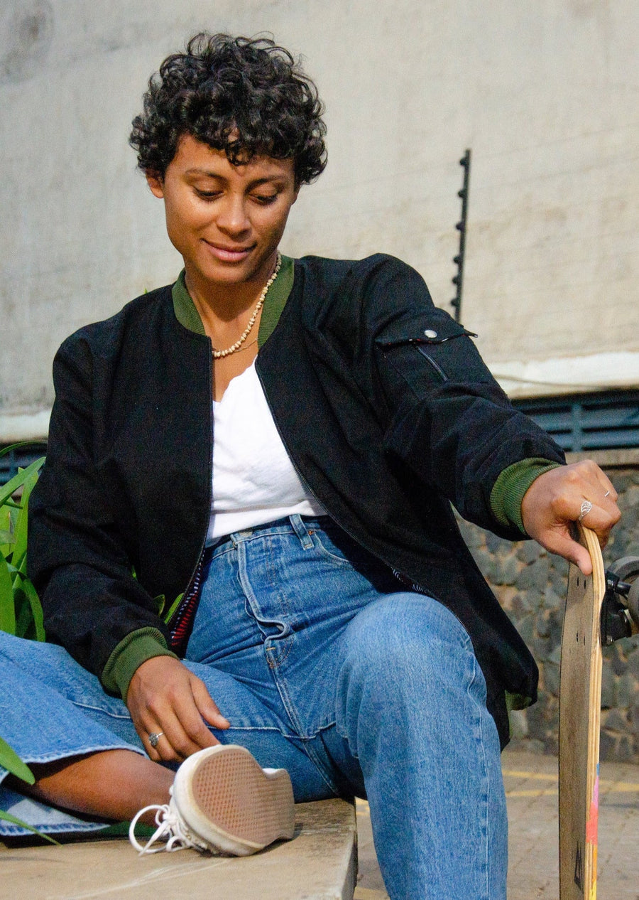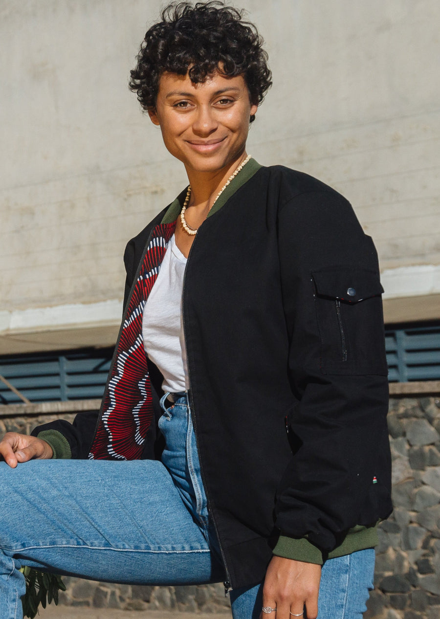 Mikono Black bomber jacket with four shoulder pockets and one inside pocket