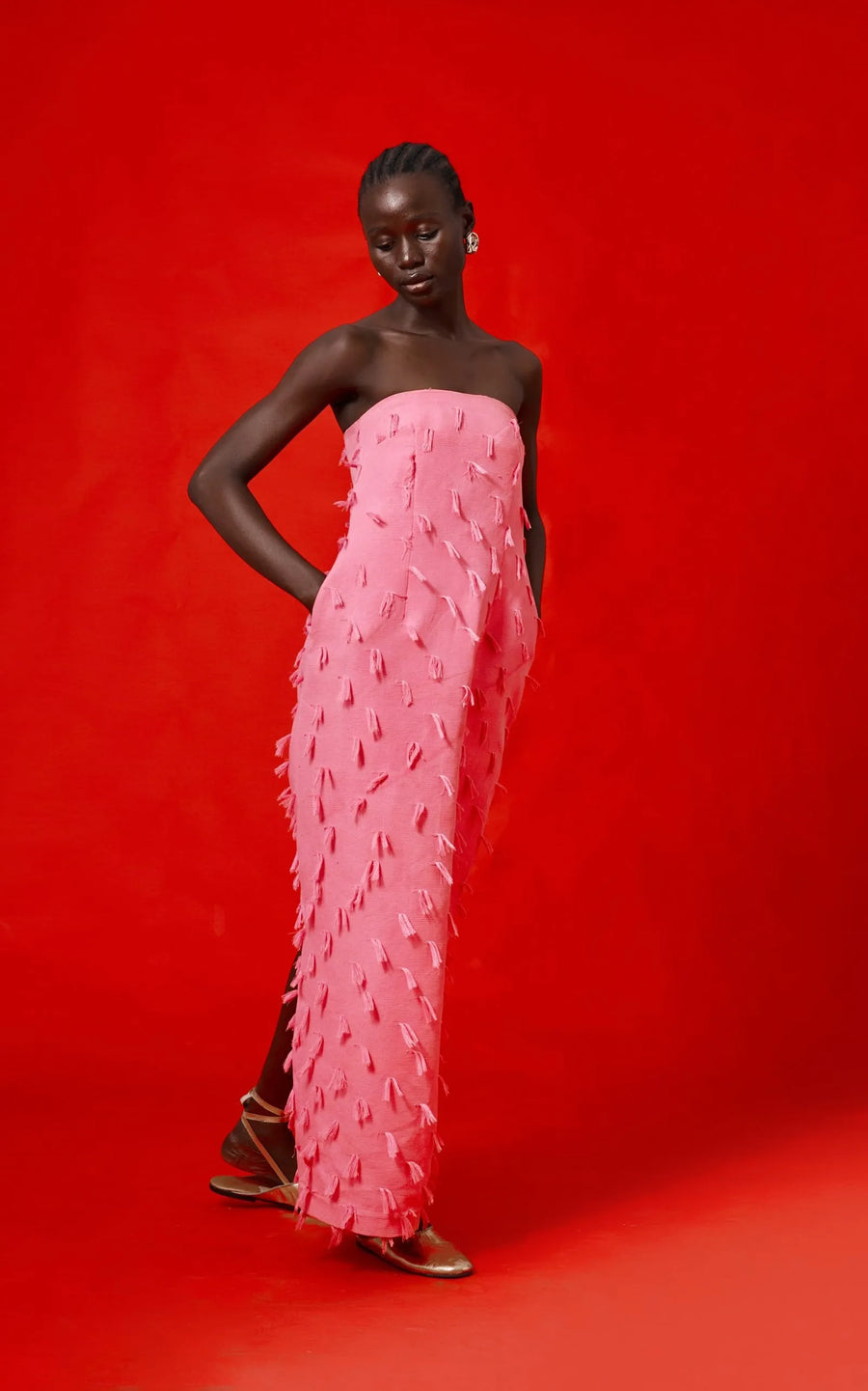 Pink tube dress with pockets. Made with hand woven aso oke fabric from iseyin, oyo state, the fabric features delicately hand embroidered tassels