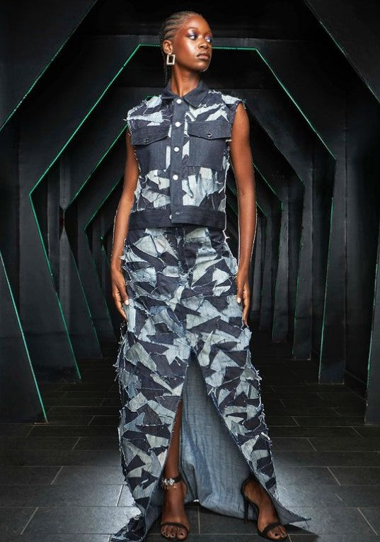 Handcrafted set made with pieces of denim. The look can be worn together or separately