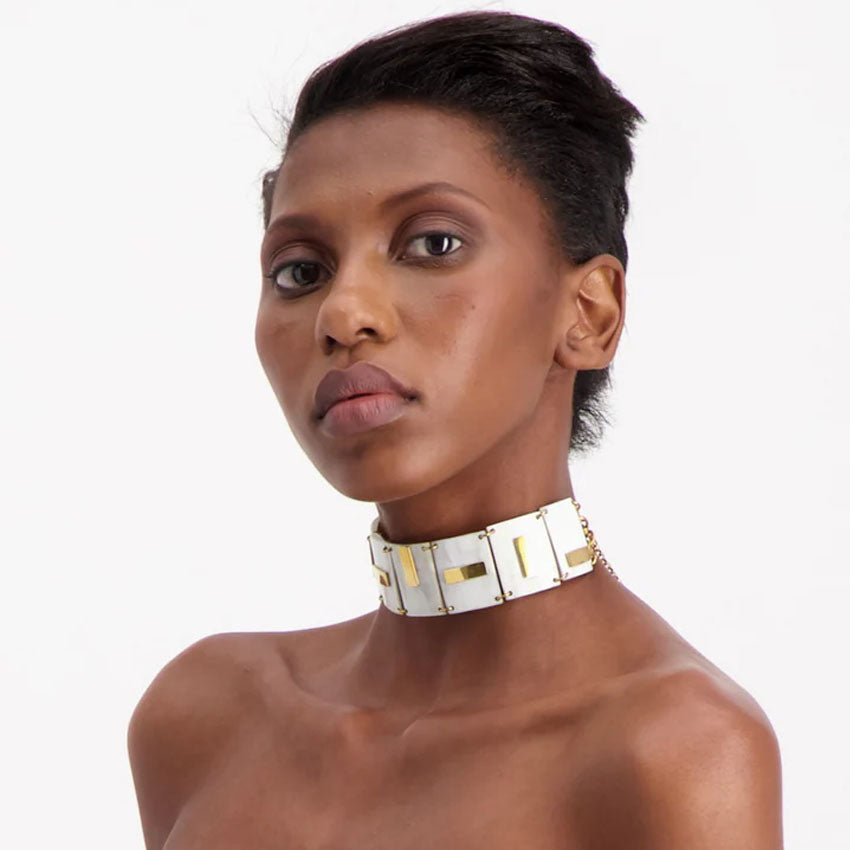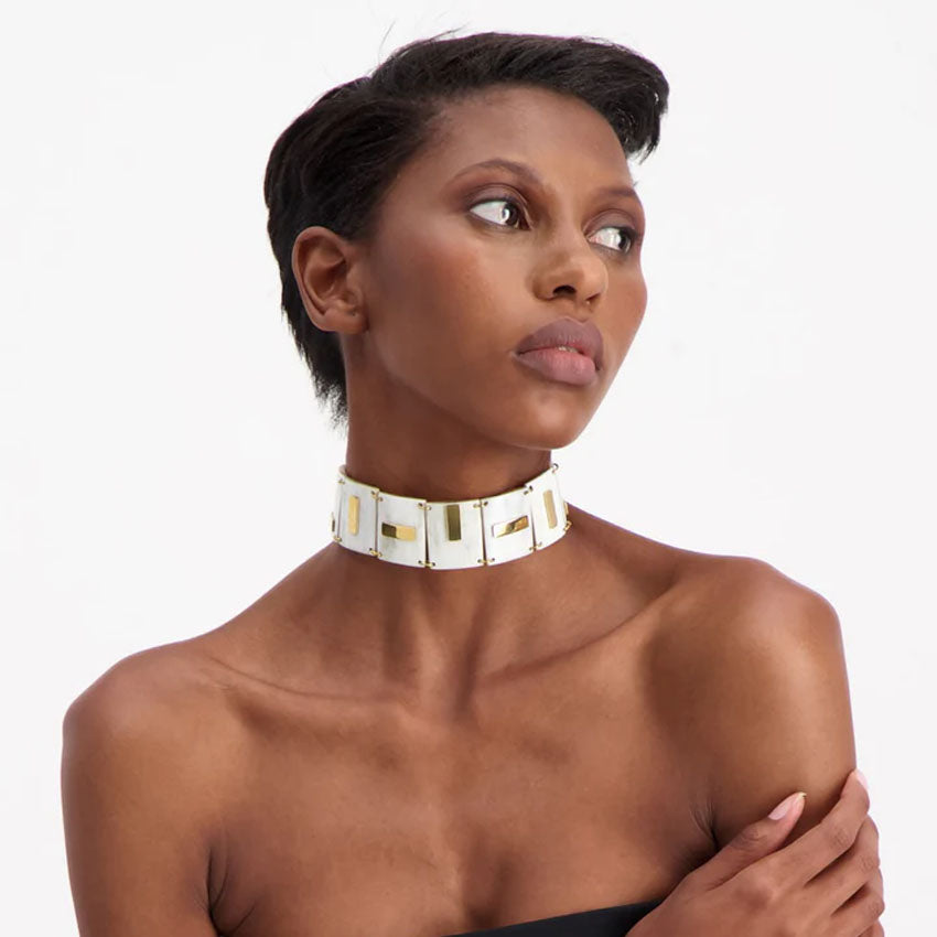 This Shield Choker features brass plaques adorned with cow horn and linked together by brass rings.