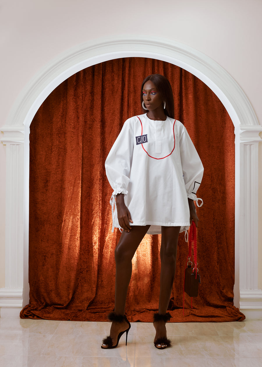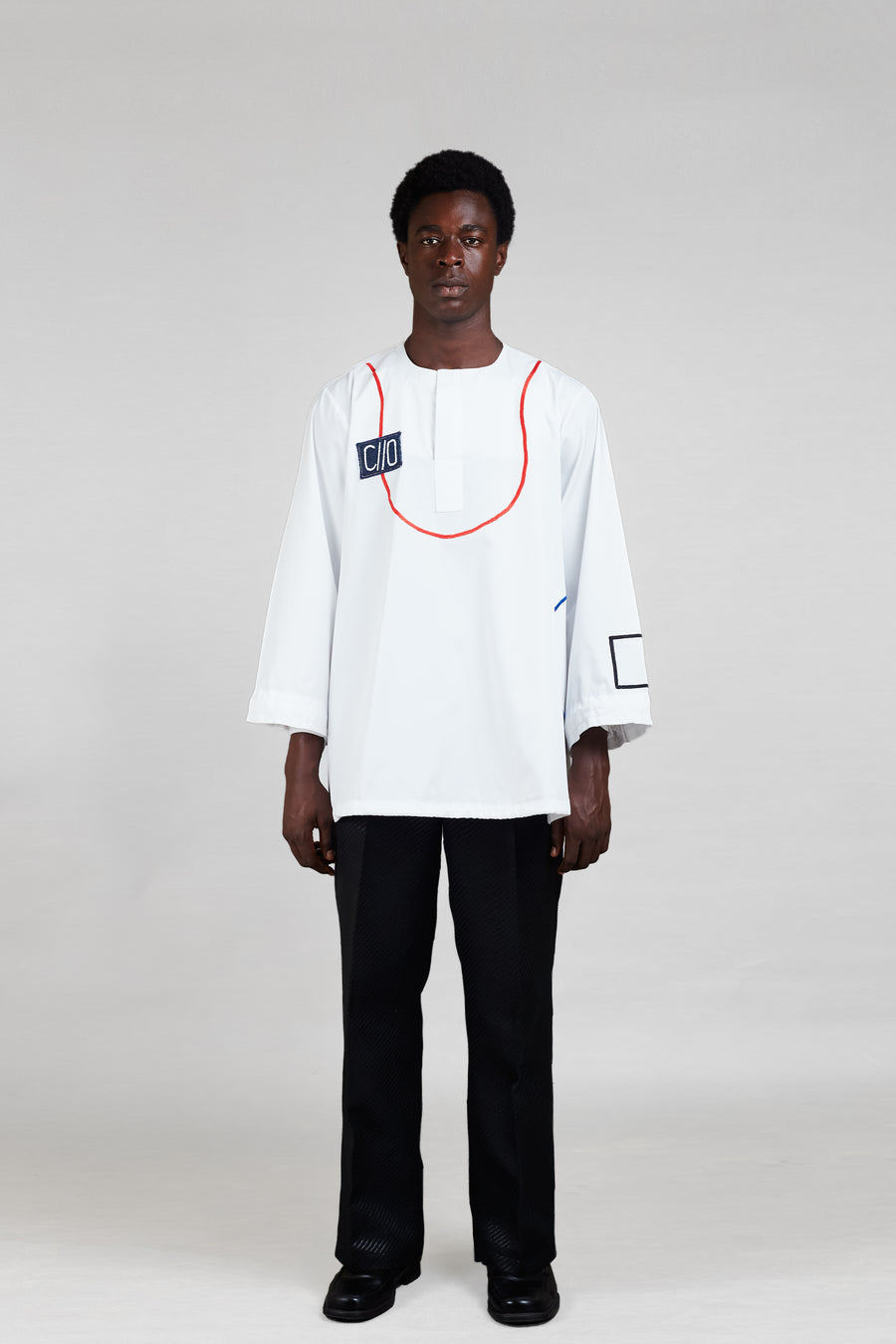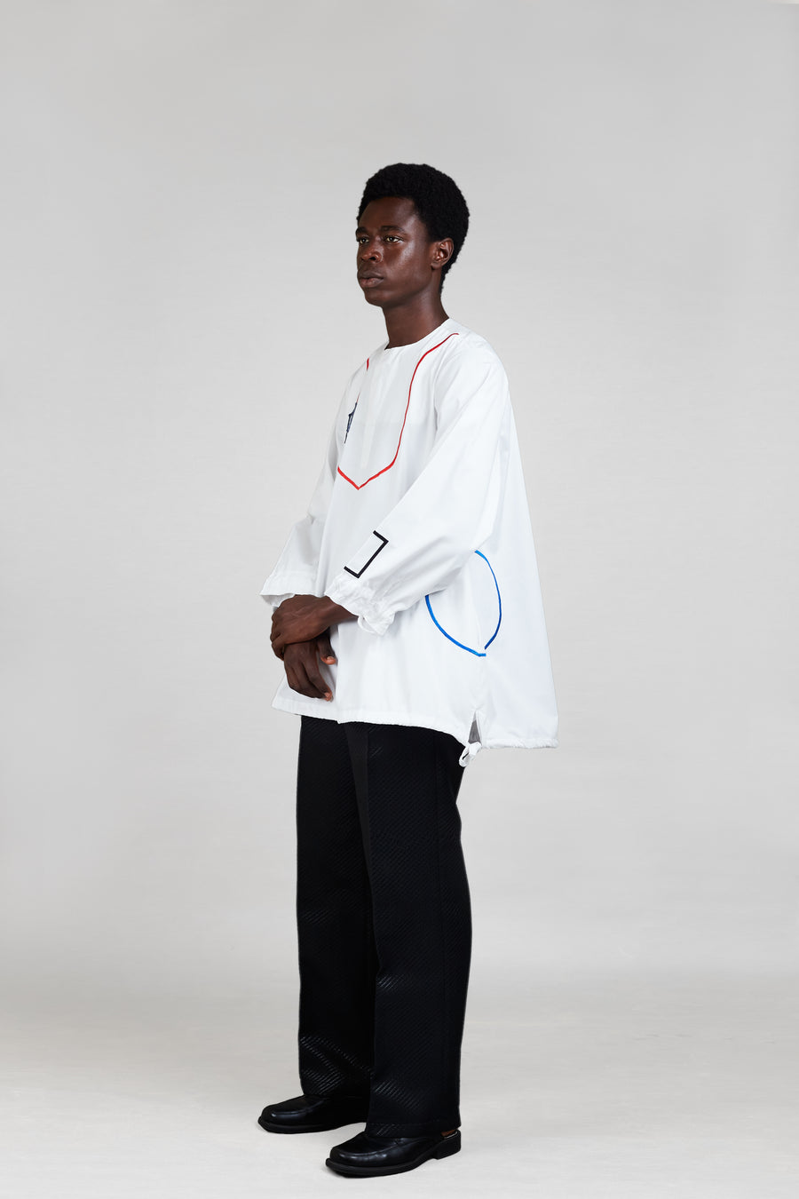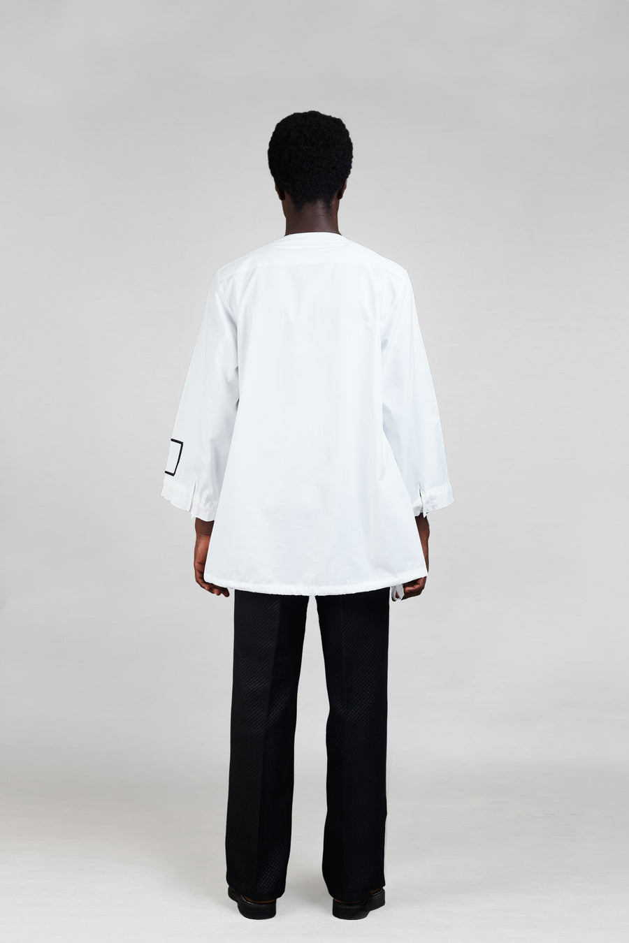 A-Line fit, Grandad collar, Popover press-stud placket, Long loose sleeve, Distinct embroidery lines, 1 side seam pocket, adjustable drawstrings on sleeve & hem, C//O embroidered logo.