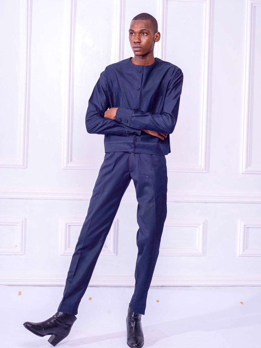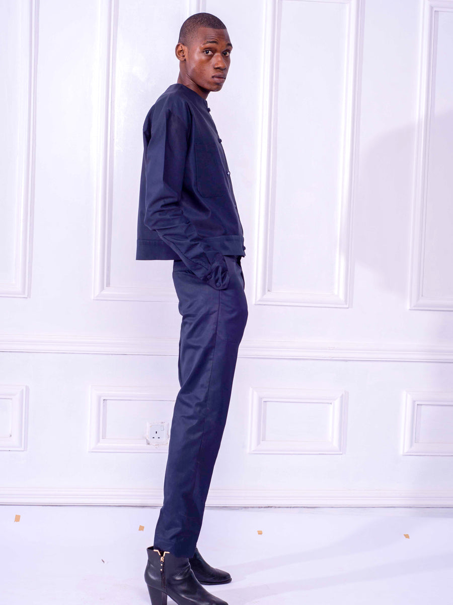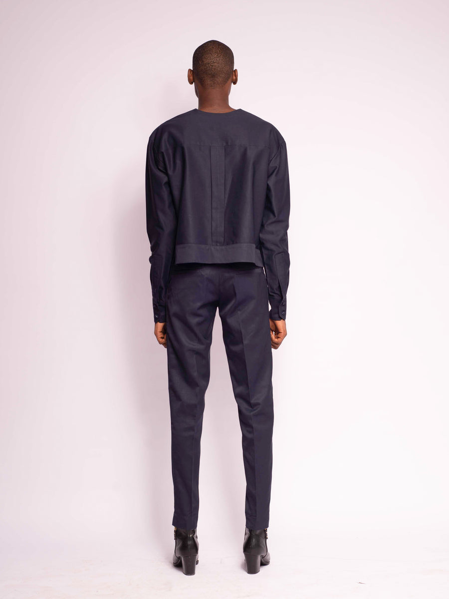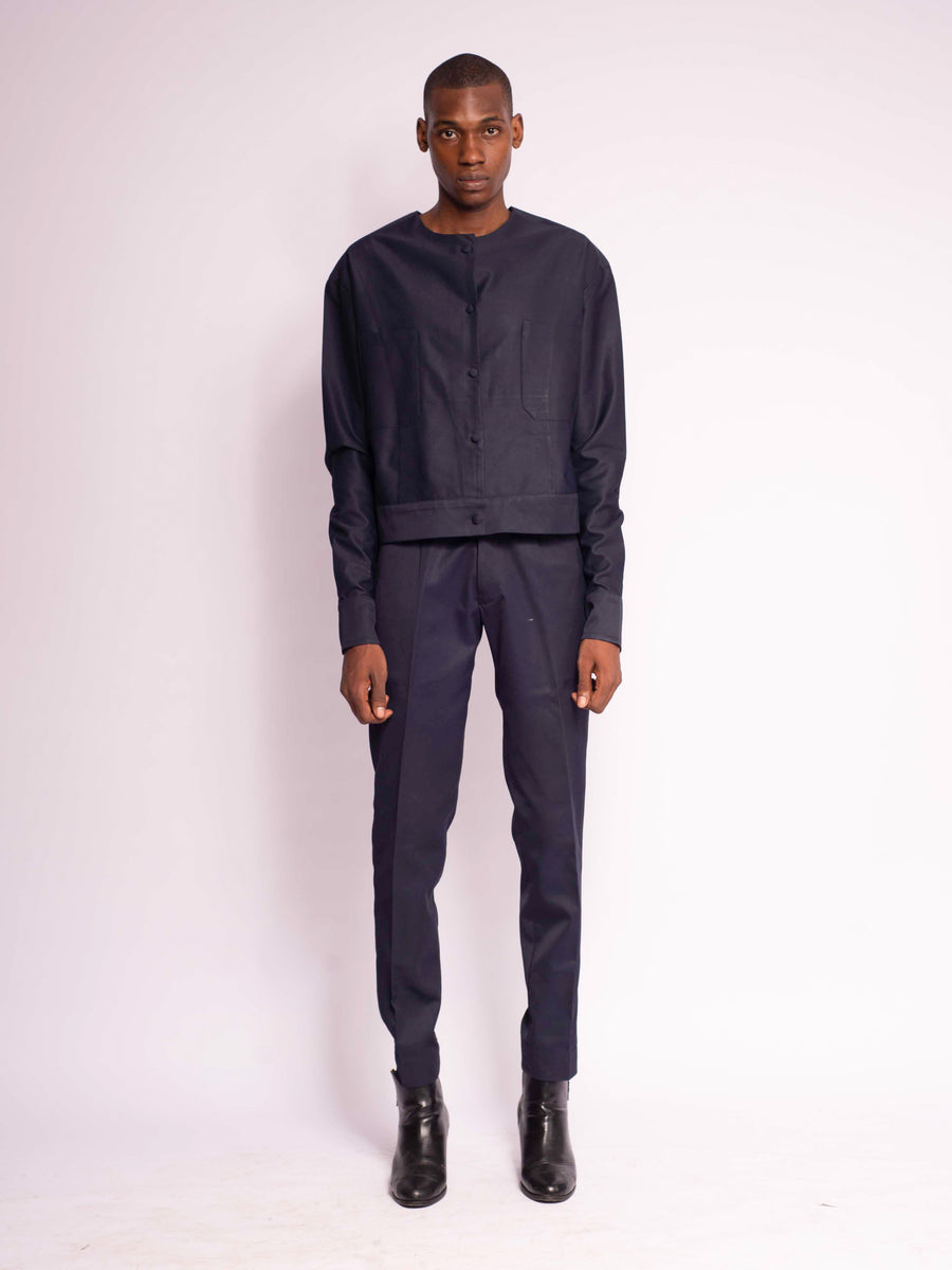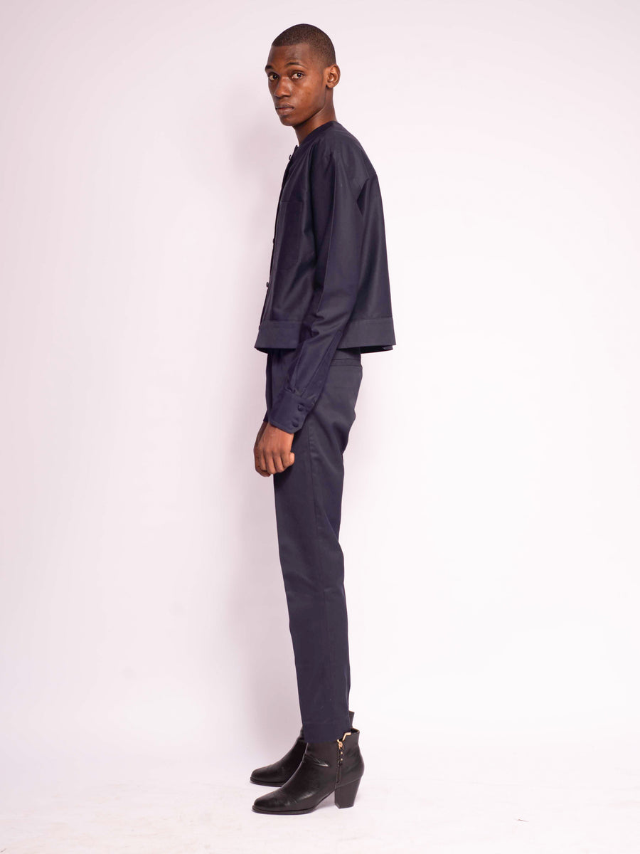 This Mini jacket is a play-on-the-regular shirt, cropped and collarless with breast pockets paired with matching pants all made from ethically sourced cotton chino fabric. Made in Lagos, Nigeria.
