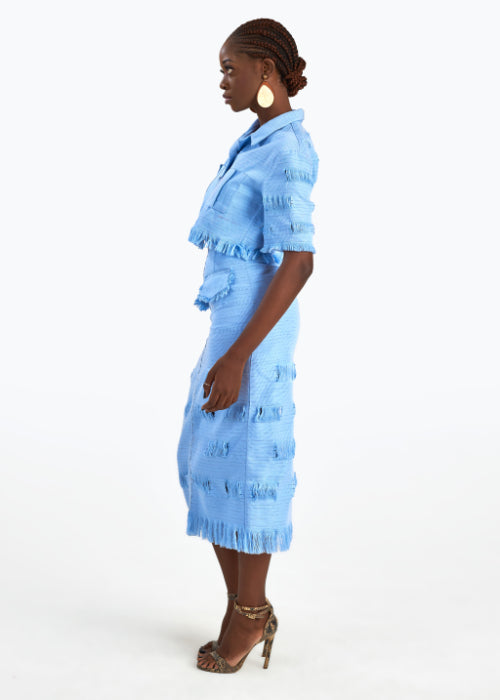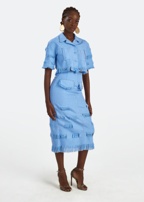 Our Busumuru shirt and skirt is crafted with traditional handwoven smock with cut out frayed detailing. Look may be worn separately or a set.