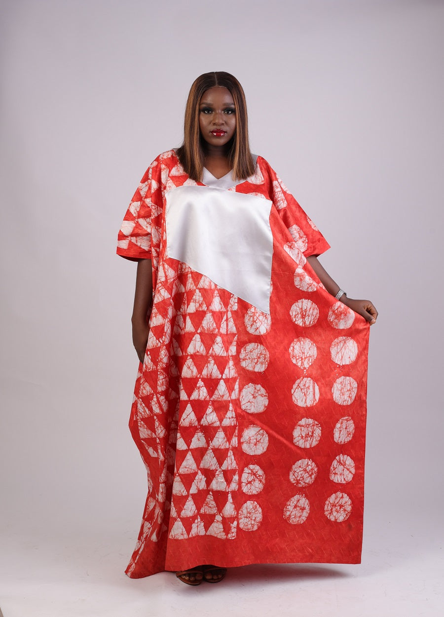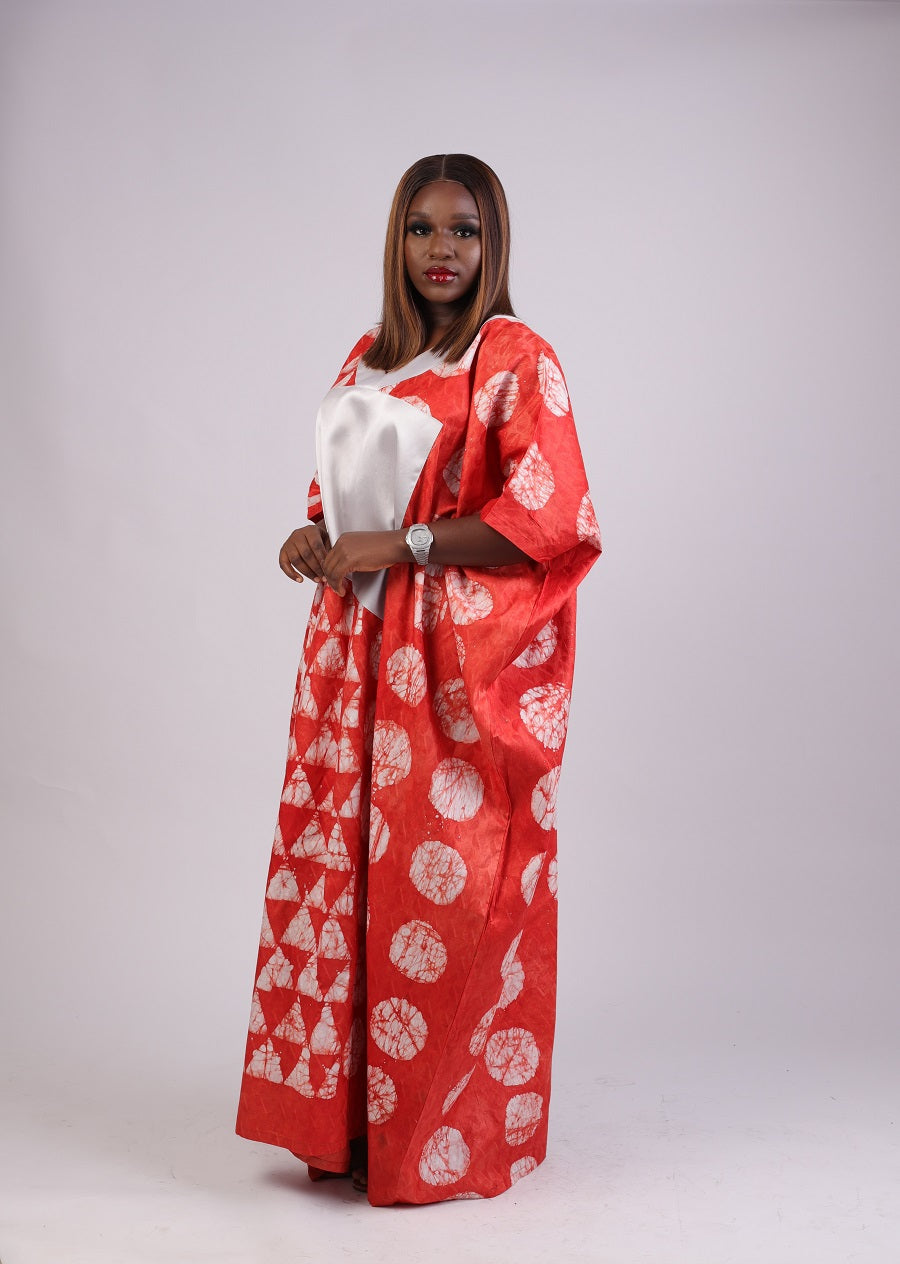 The Chuma dress is a beauty to behold, it is an African cotton brocade boubou dress with a  bold and unique tie dye print combined with silk fabric to form a v-neck and unique chest pattern. It embraces  the elegance of the African culture and royalty. It is made with cotton adire and designed to stay comfortably on the skin.