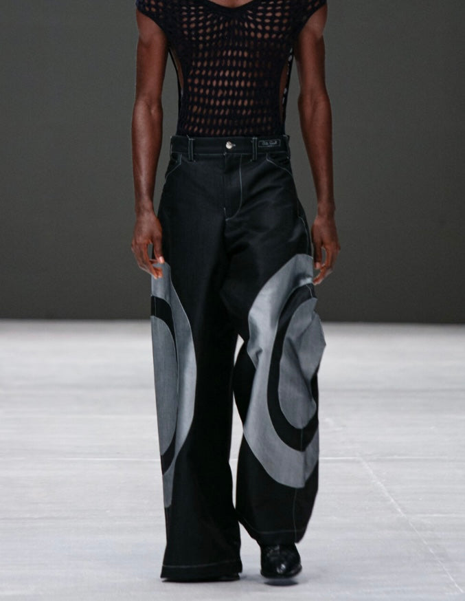 The wide-leg silhouette offers a contemporary twist on a classic staple, while the grey circular patched details add a touch of whimsical charm and individuality. Each patch tells a story of creativity and craftsmanship, transforming ordinary denim into a work of wearable art.