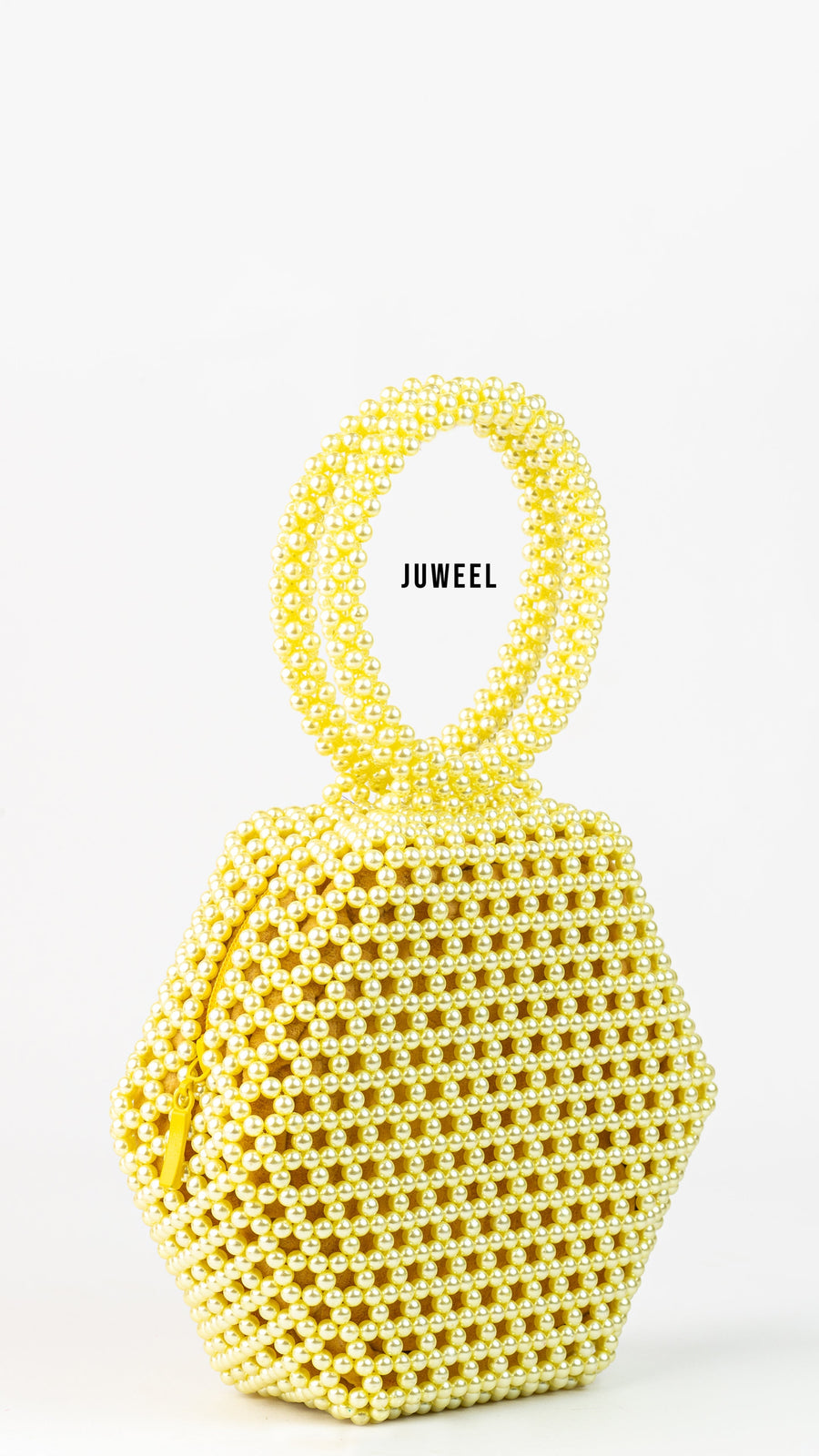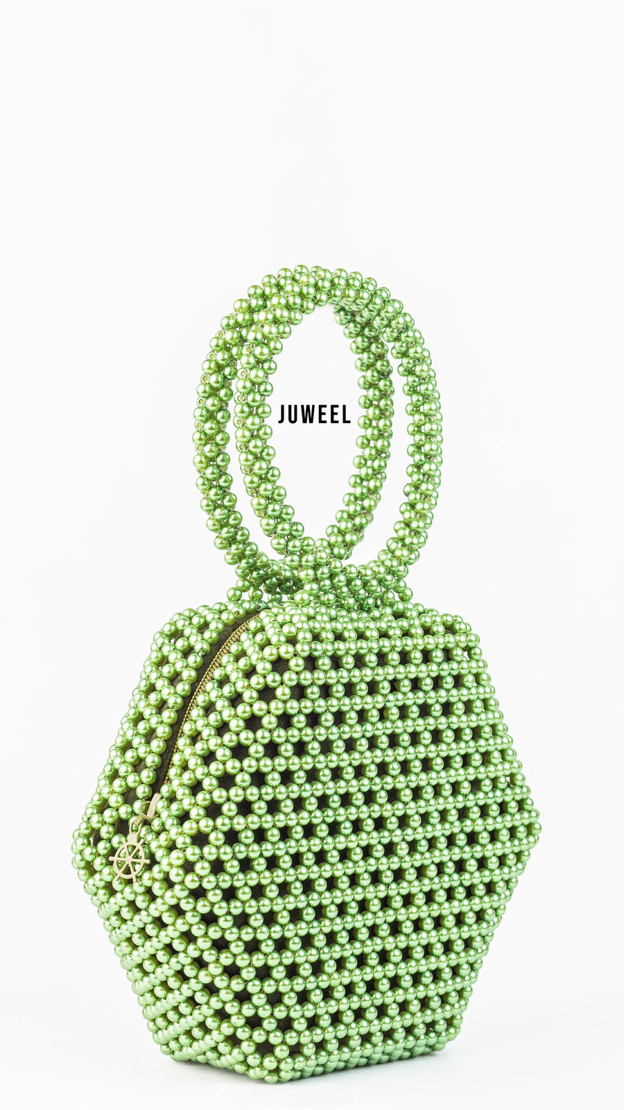 The Hexie Bag is a hexagon shaped handheld bag with a zipper. The bag is lined with suede to pop out the color of the beads. Inside the bag has a pocket to store smaller items.