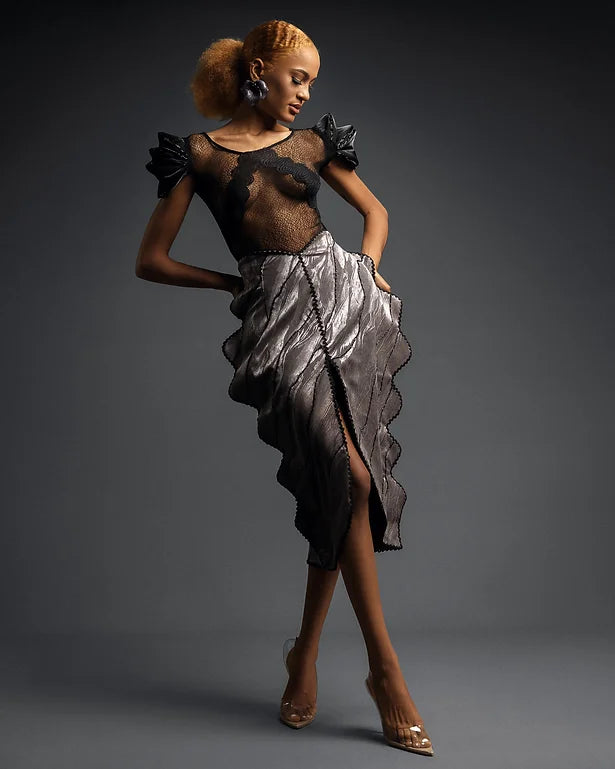 Nia Grey Wavy Skirt & Black Silk Top Set – ADJOAA