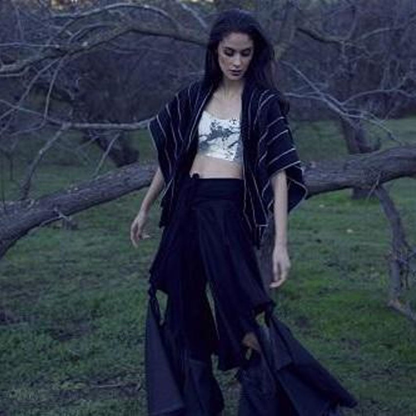 Maxi culottes with deconstructed leg, front fly closure, and wrap-around waistband sash.