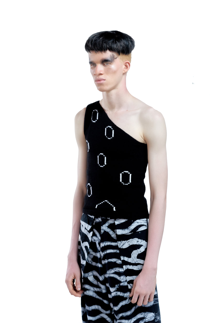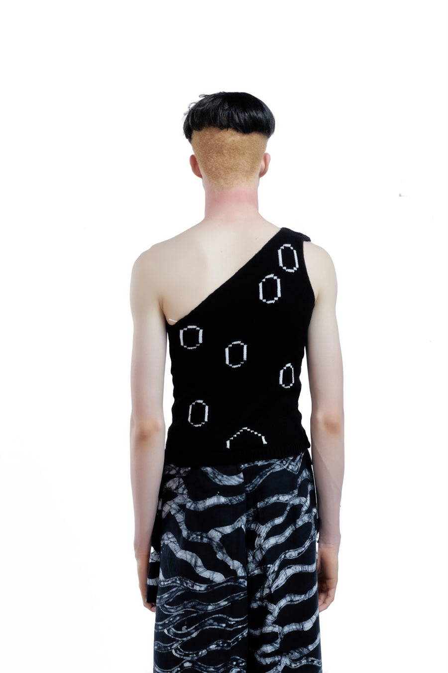 Form-fitting one-arm handknitted vest made with wool and “O” design