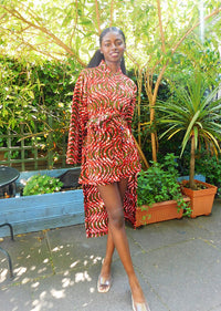 ER-ZUM-AH is a celebrated fashion designer known for her distinct African-influenced designs. With 12 years of experience under her belt through the Bestow Elan label, she infuses each garment with enthusiasm and intuition. Our Precious Cotton Kimono is an ideal summer piece! This high/low Kimono is versatile--pair it with another item, wear it as a cover up, or with the matching cropped trousers! Made of Cotton Wax print fabric, it features high side splits, a thick collar, and a strong tie to keep everything secure. Partially lined and crafted in the UK, this jacket requires handwashing or dry cleaning to preserve its beauty.