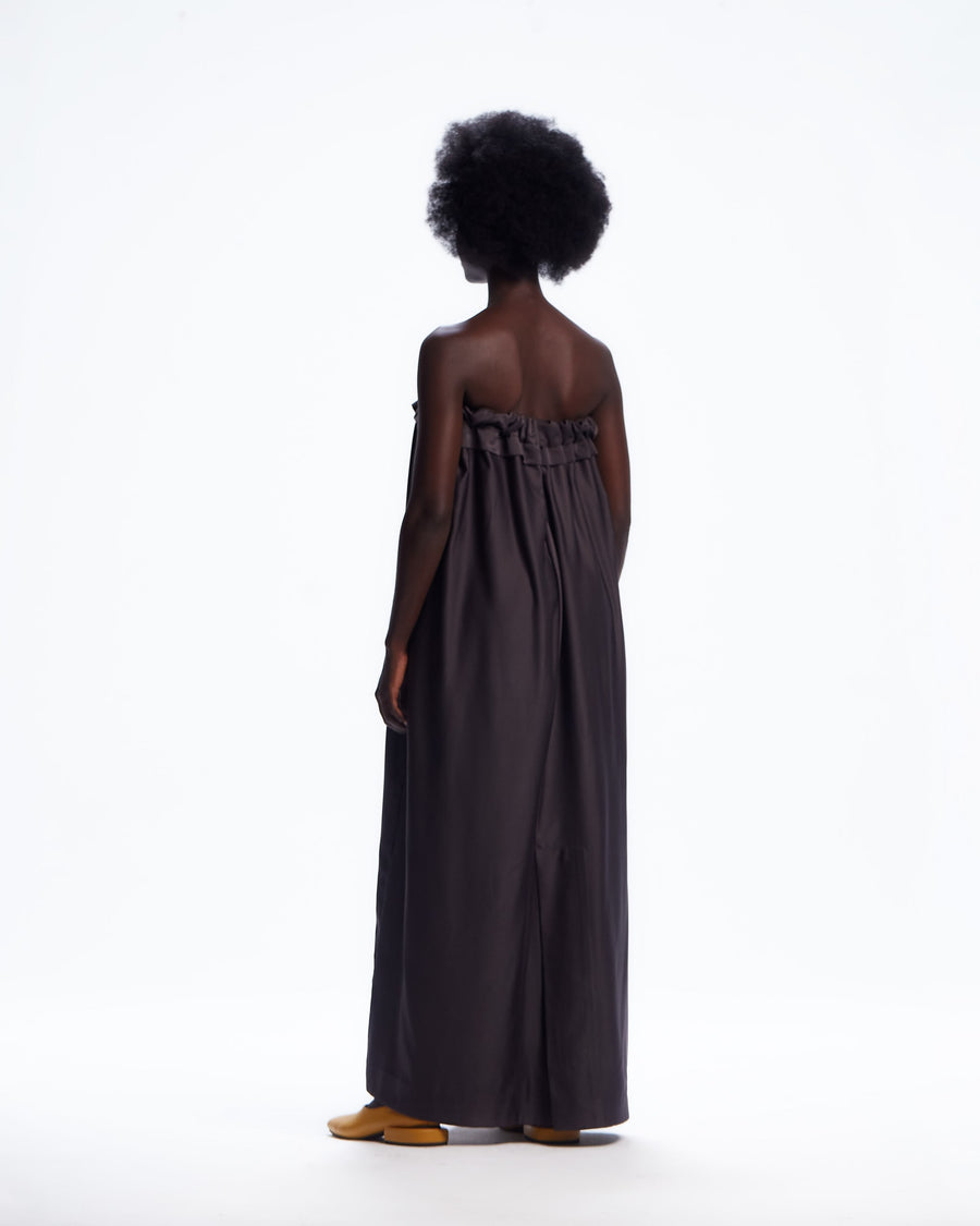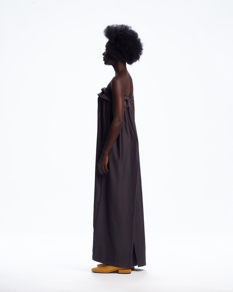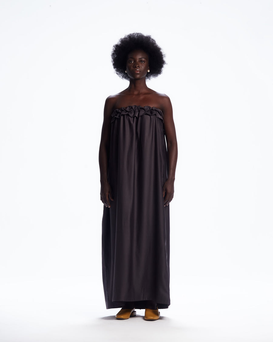 AJABENG stands as a versatile Ghanaian fashion establishment, seamlessly merging the essence of minimalism with the rich tapestry of African art and culture. This unisex brand draws inspiration from the vibrant hues of traditional African attire, the inventive DIY flair found in Accra's streetwear scene, and the captivating geometry inherent in art deco architecture. The AJABENG Abban Dress, draped in a deep espresso Crepe Blend fabric, recommends Dry Cleaning for optimal care. It boasts an elastic ruffle band, an alluring open slit, and practical side pockets. Crafted sustainably in Ghana, this dress artfully marries elements of femininity and masculinity, creating a look that's both pioneering and timeless. The brand's dedication to sustainability resonates across its practices – from responsible sourcing and empowering young African talents to prioritizing the use of biodegradable materials in its exquisite garments.