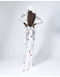 Embellished See Through Soft White Lace With Low Waist Open Back And Floor Lent Train With Hand Stitched Petals And Crystals Made With Recycled And Ethically Sourced Fabrics.
