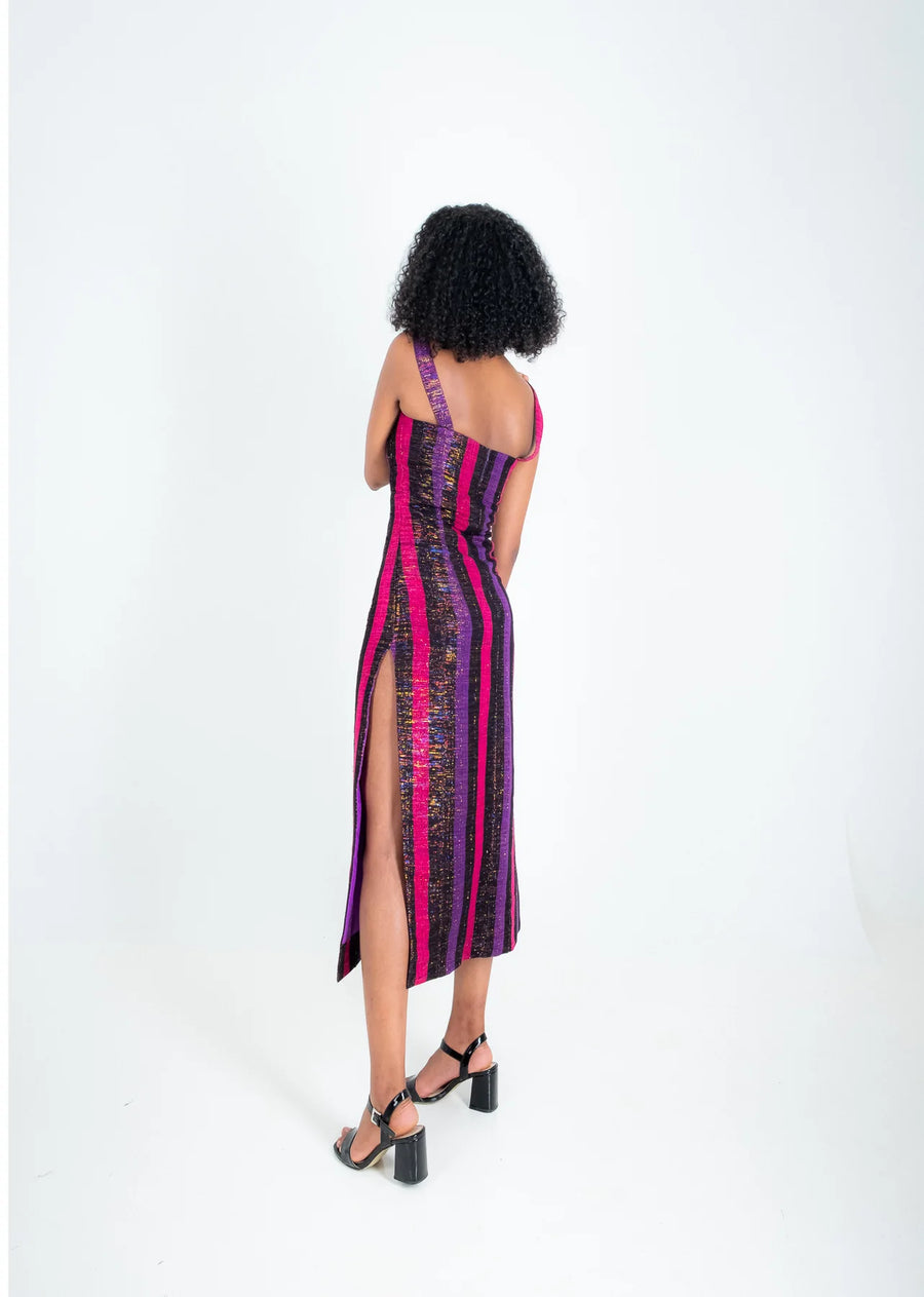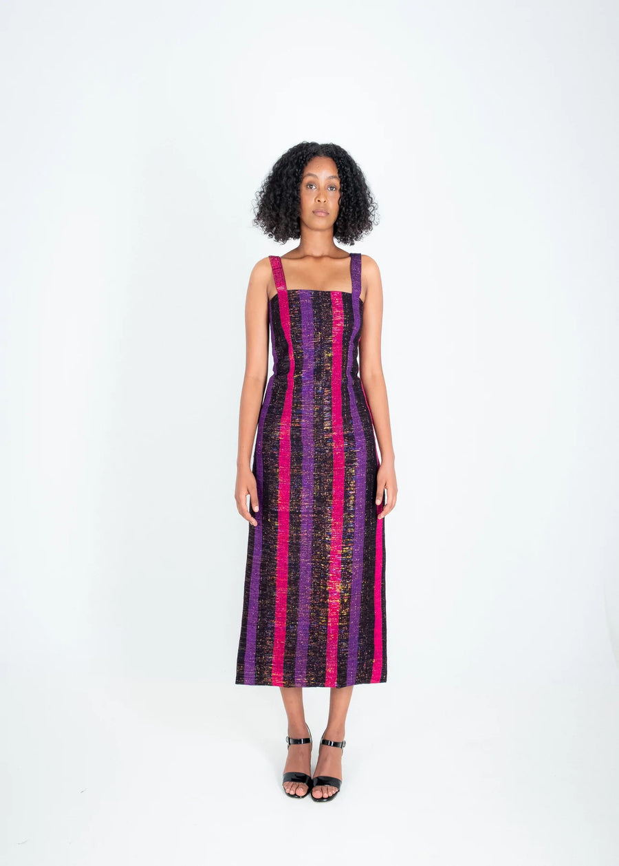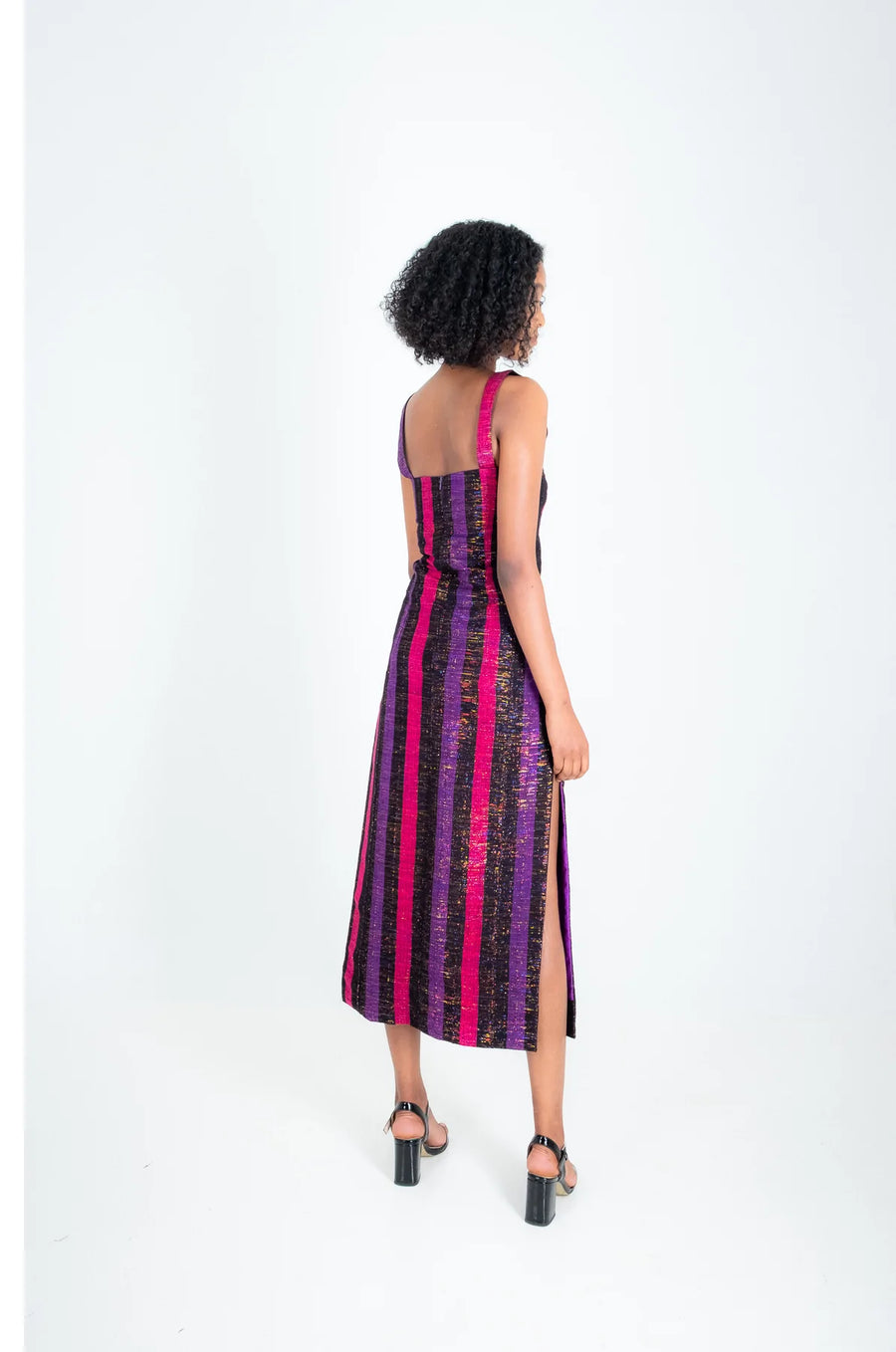 The deep neckline, decisive double slit, open back, Aya dress makes it a piece you will return to again and again. It's cut from a glimmering handwoven cotton.