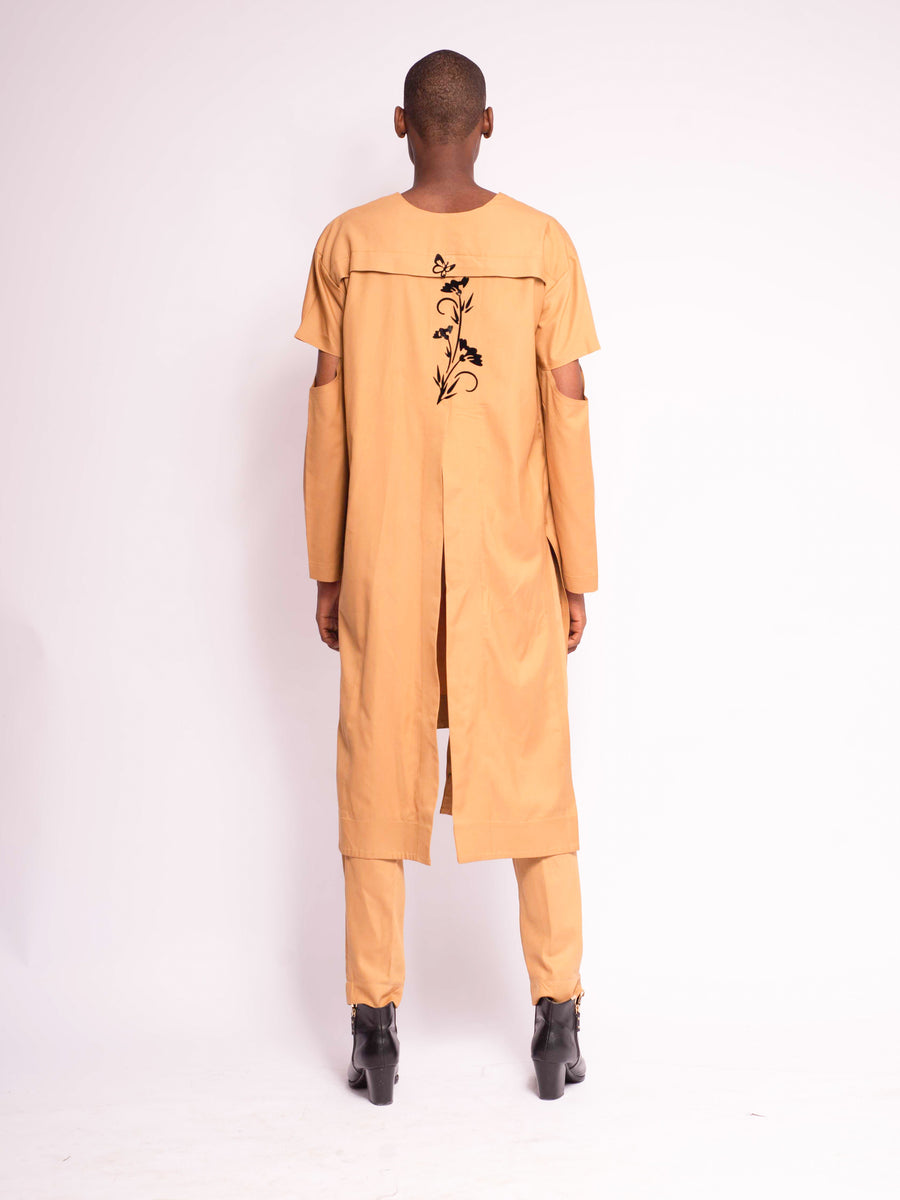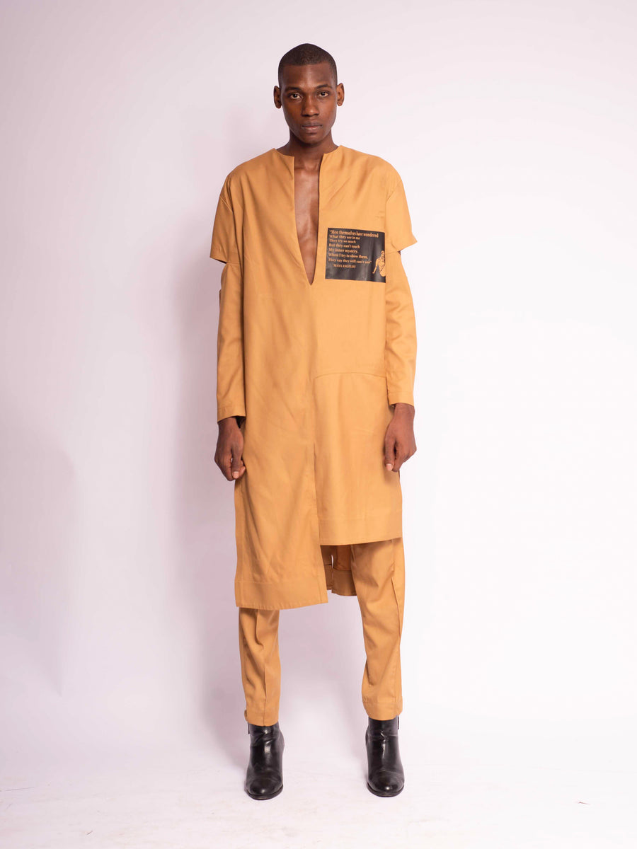 Screen printed tunic with words from Maya Angelou, layered cuts, cut-out detail on the sleeves, open back slit vent paired with matching pants all made with ethically sourced raw cotton. Made In Lagos, Nigeria.