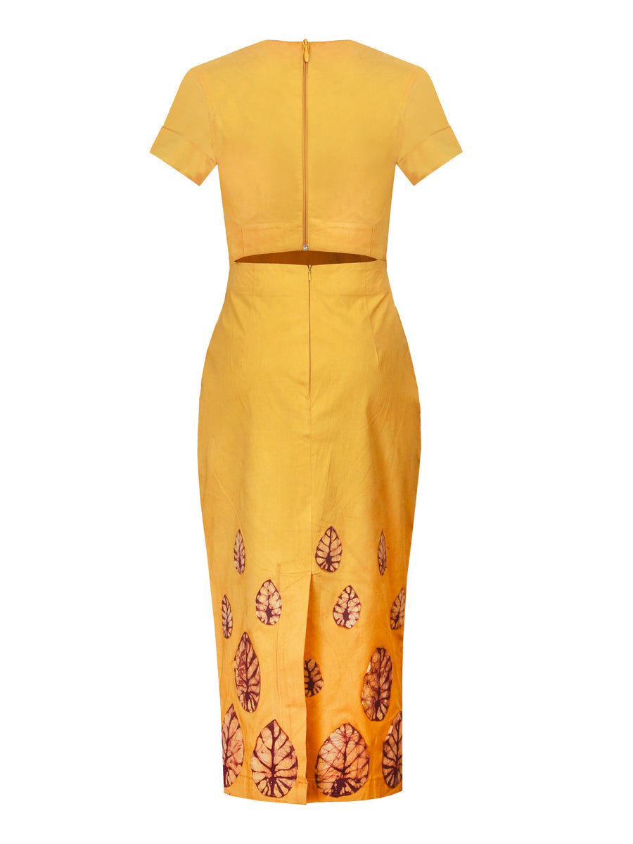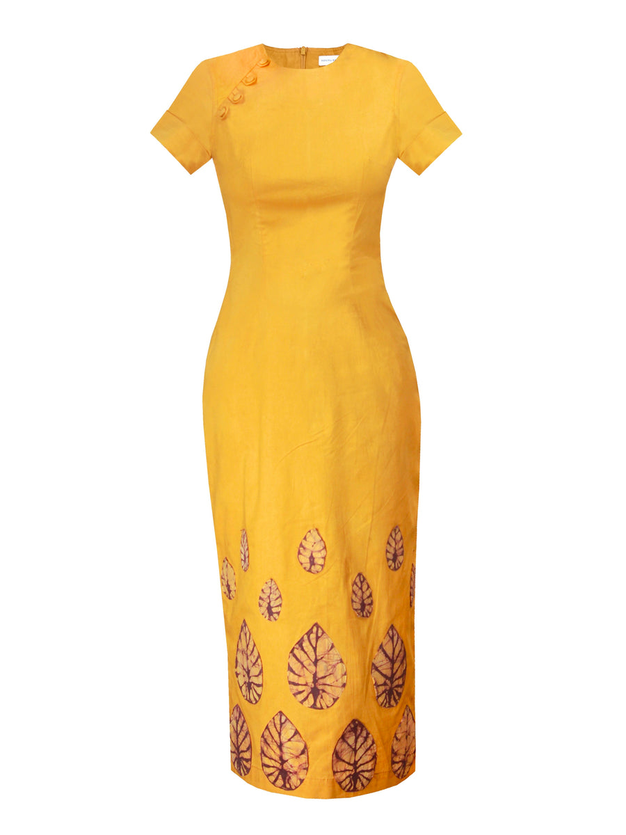 Want to appear formal and show a bit of skin? The Roxanne Dress is a great pick. Made to fit close to the body, it features cut out at the back bodies, decorative cover buttons at neckline cut outs of contrasting yellow and black pear leaf prints, patched and sewn individually around the hem. Roxanne dress is made in cotton with minimal stretch for ease, its hand dyed by our artisans in royal blue colour which was inspired by the blue butterfly. The hand dying process is done in a way to create a patchy washed out effect on the fabric, this takes 1-2 days. Style yours with stilettos, pair with Hera jacket on cooler days.