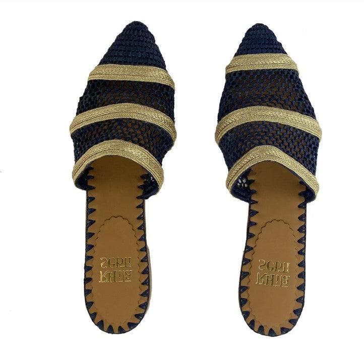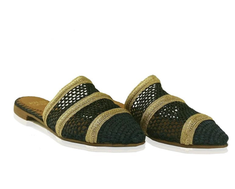 Crafted from natural raffia, the Rafina Knitted Mule features three bands of dazzling gold thread, known as 'Sfifa'.