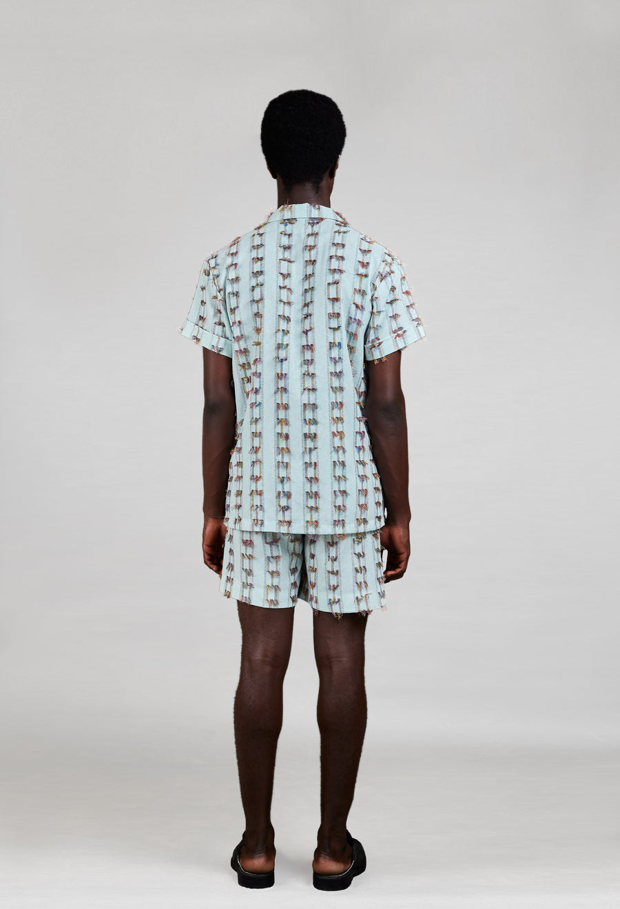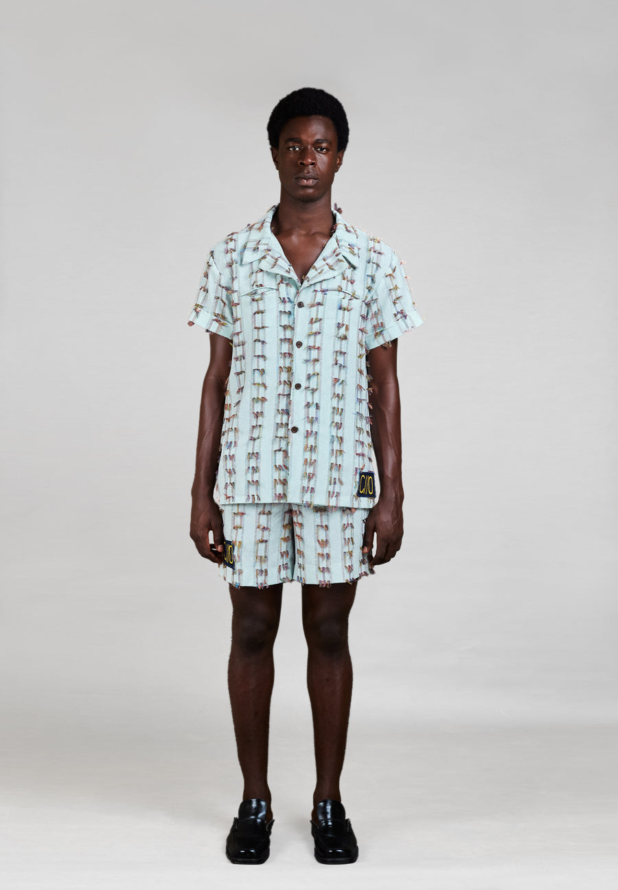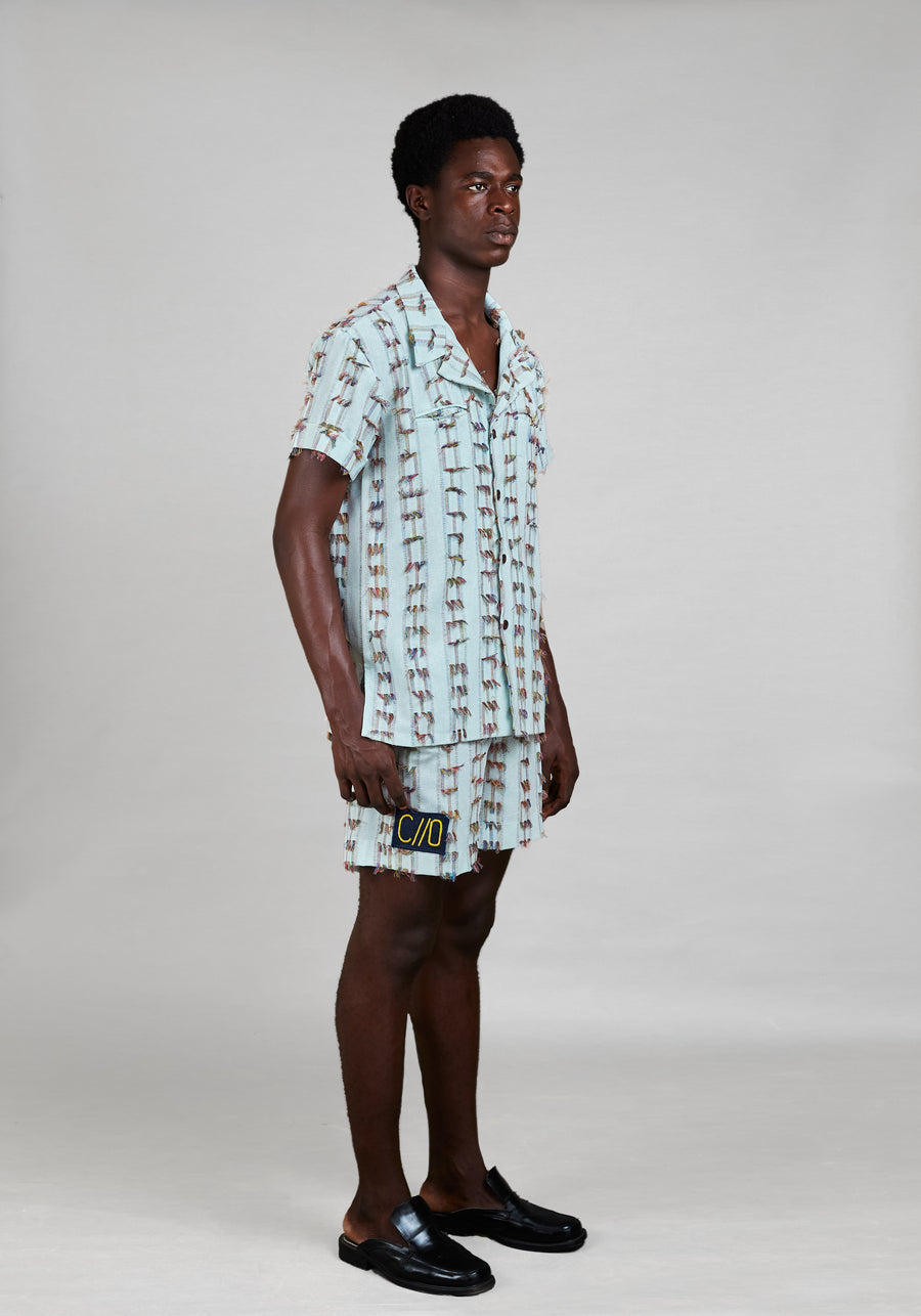 Casual Relaxed Fit, Frayed detail on fabric, Short sleeve, Bowling collar, Wooden Buttons, 2 welt pockets, C//O Embroidered Logo.