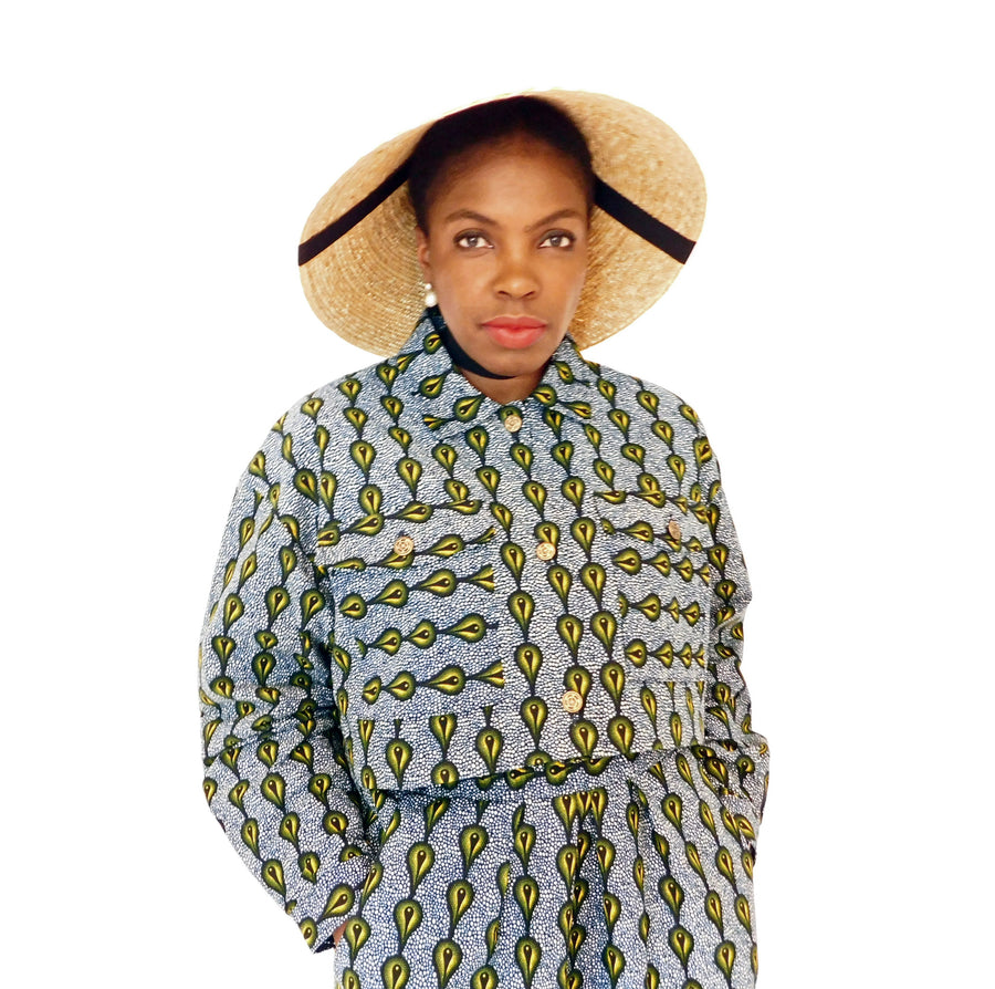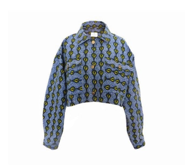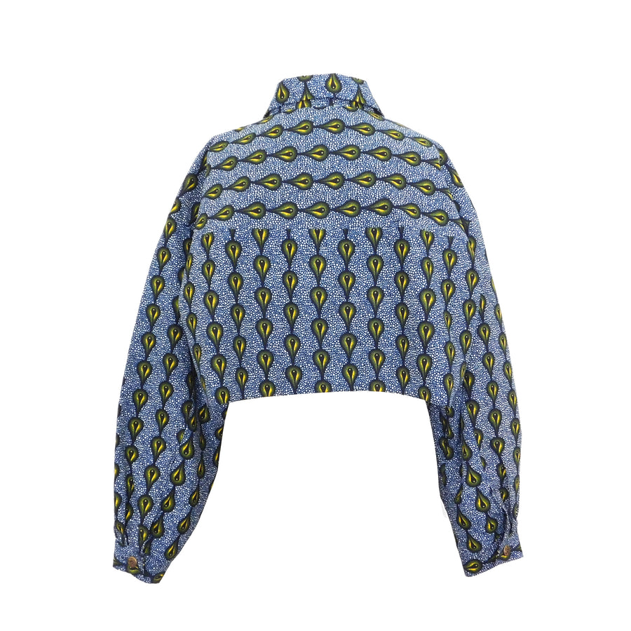 Locally-sourced cotton print fabric constructs this boxy jacket, boasting two large front-buttoned pockets and elongated sleeves for ease of wear. Highly complementary of high-waisted items, this jacket pairs well with flared trousers and long calf-length skirts.