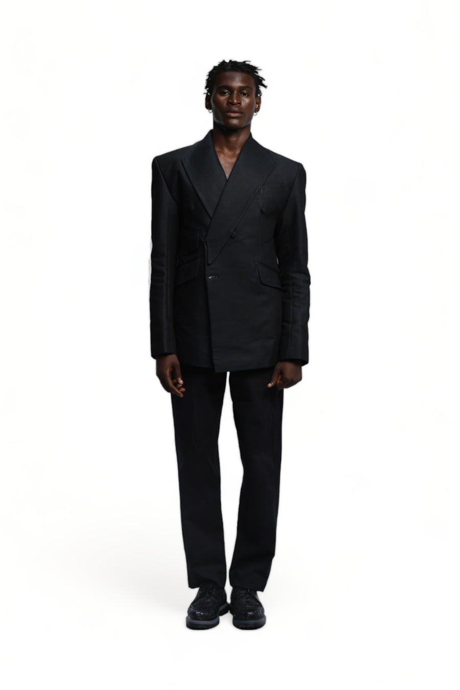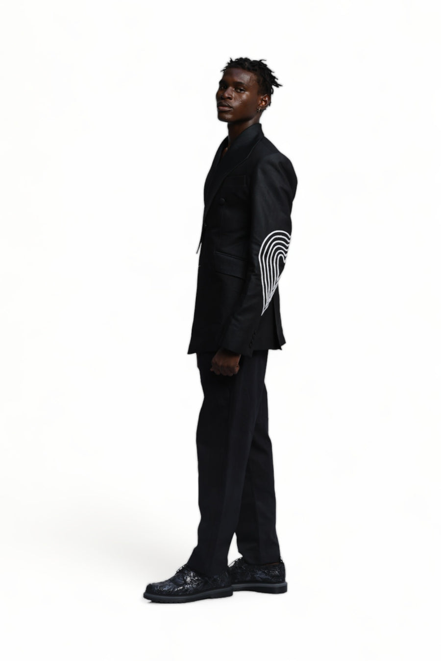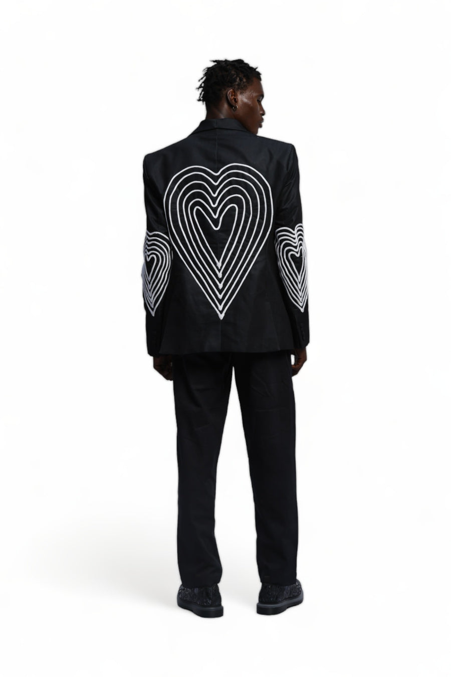The double-breasted jacket features a sweeping maxi lapel, commanding attention with its bold yet timeless silhouette. But it’s the intricate 3D embroidery details that truly set this suit apart. Adorning the sleeves and back with a love motif, each stitch tells a story of passion and romance, adding a touch of whimsical charm to your ensemble.