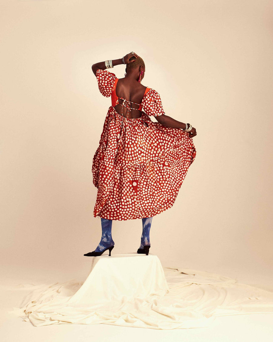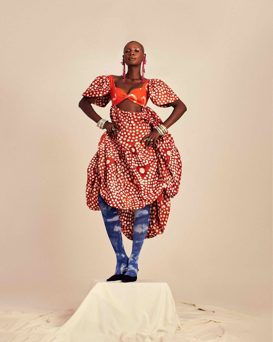 Introducing our Orange Draped Adire Dress by Sisè, a stunning masterpiece of style and elegance. This dress fuses traditional craftsmanship with modern design, making it an ideal choice for fashion-forward women. It features a unique cut-out detail at the back, providing tasteful glimpses of skin in an elegant manner. The gathered waist cinches at the narrowest point for a flattering and comfortable fit, while the balcony cut sweetheart neckline adds a touch of romantic charm. Sisè celebrates individuality and allows for unique styles to be expressed with confidence and authenticity. They draw inspiration from Afrocentric and multi-ethnic cultures, creating pieces that are both playful and comfortable, and combine tradition with modernity. Celebrate the fusion of cultures, the diversity of colors, and the art of self-expression with us.