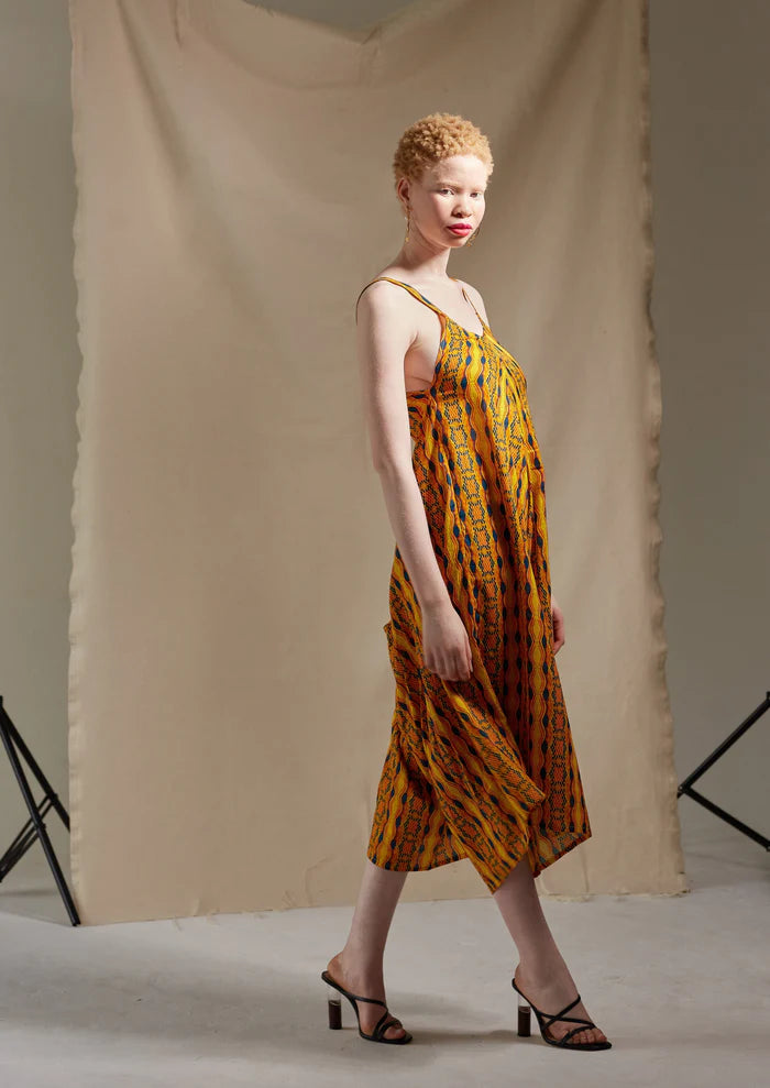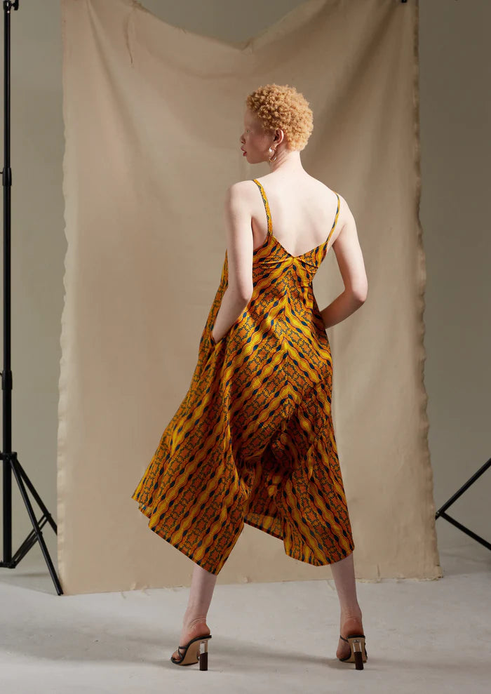 Boxy style jumpsuit with spaghetti straps, v-neck and side pockets comes in our custom desert yellow print. Named after Kano is a city in northern Nigeria and the capital of Kano State. 100% Cotton. Ethically Made in Africa using fair trade practices.