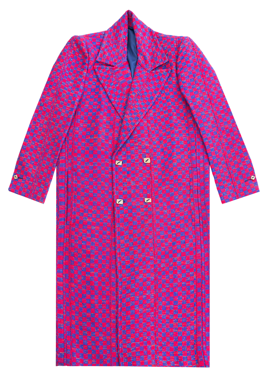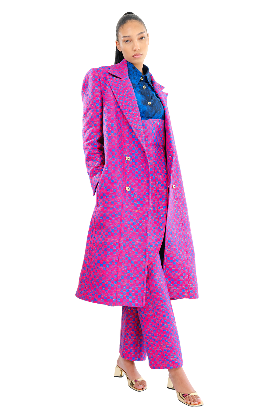 The Ella I coat commands attention with its striking blue and pink color palette and sophisticated double-breasted design. This long coat blends classic tailoring with a modern twist, making it a standout piece for any stylish wardrobe.
