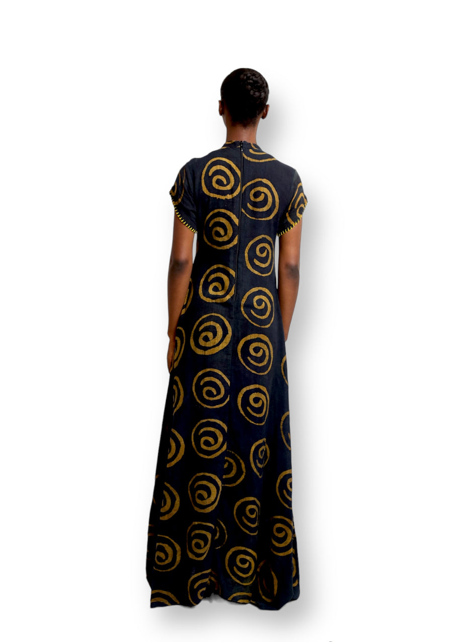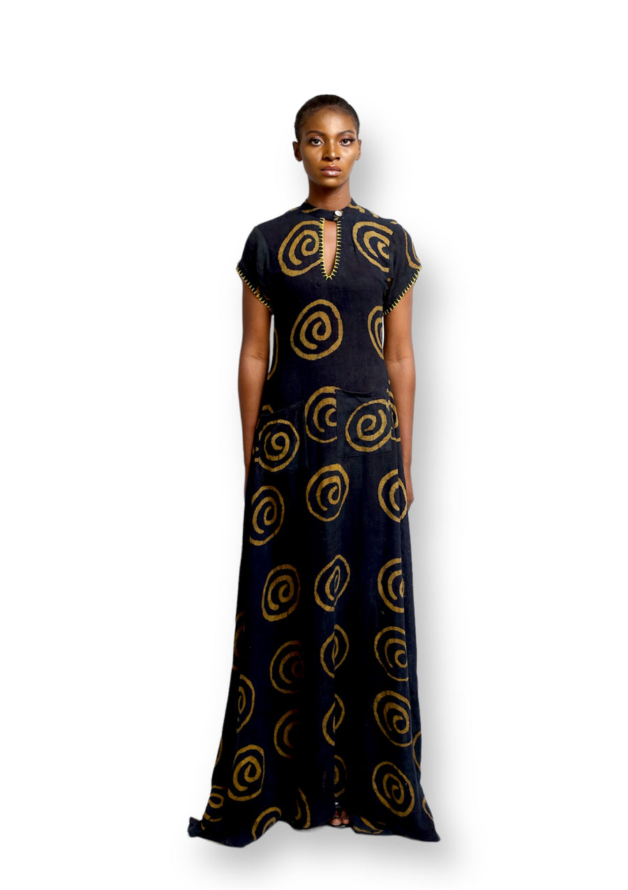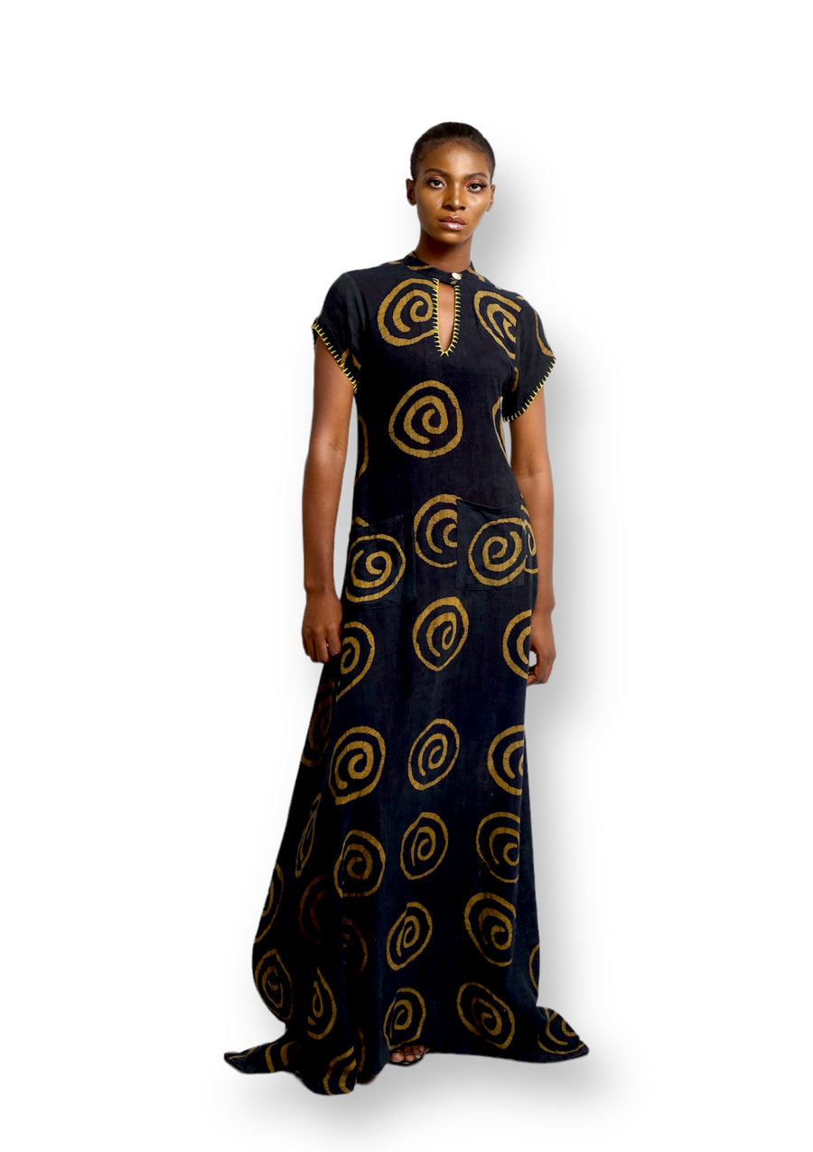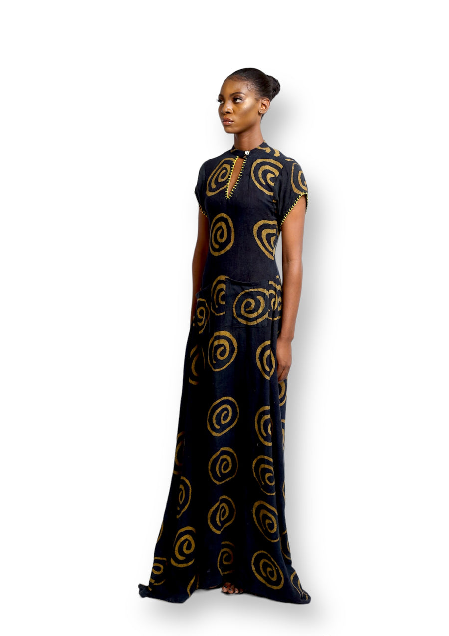 This Short sleeve Maxi dress is crafted with locally sourced deadstock viscose Batik fabric and features a Deep Keyhole neckline with single button. Additionally, the Cute Saint emblem Motif Highlight adds a stylish touch to the Maxi length dress. It's both comfortable and breathable, making it perfect for the summer heat or as a stylish layer when it's cold outside.