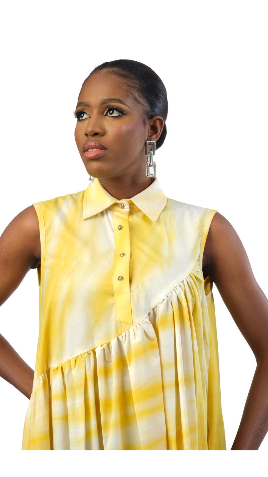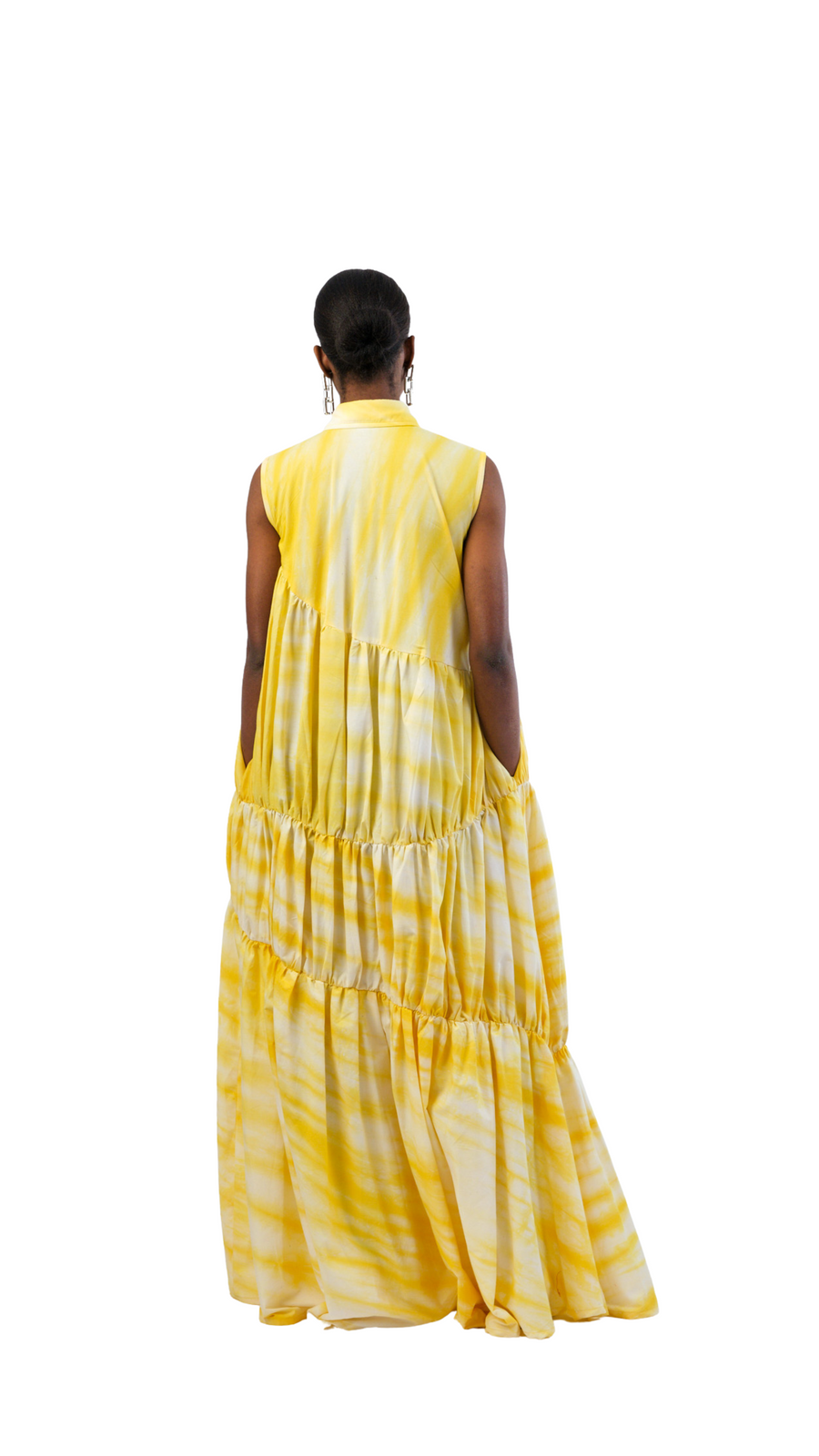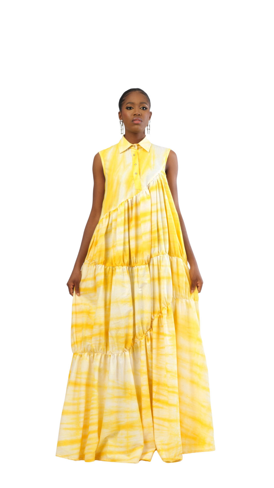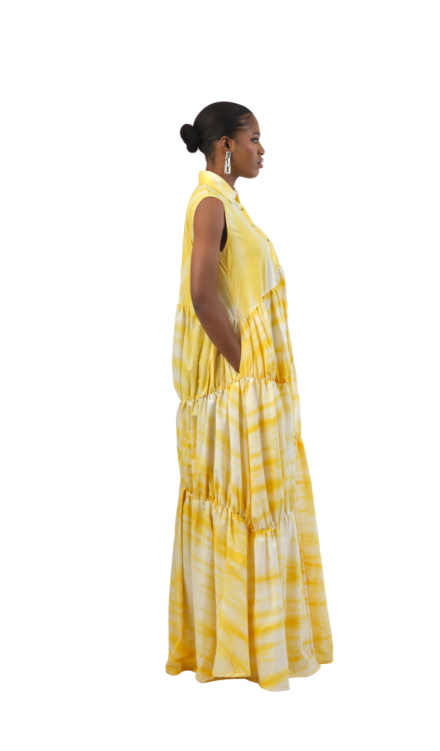 The Vennette dress is structured, light weight, has movement and makes a statement. Made from cotton, it’s the perfect day to evening dress, can be a day and night wear. This dress was hand-dyed by our artisans into our sunflower print, it features decorative rhinestones in front placket, side pockets, and press buttons. The hand dying process takes 1-2 days . Always walk with gracefulness and own the room in Vennette. This gathered 3 tier dress is a great pick for your next garden party.