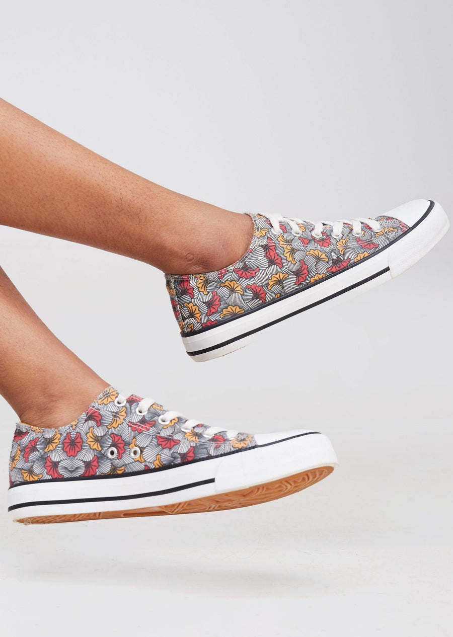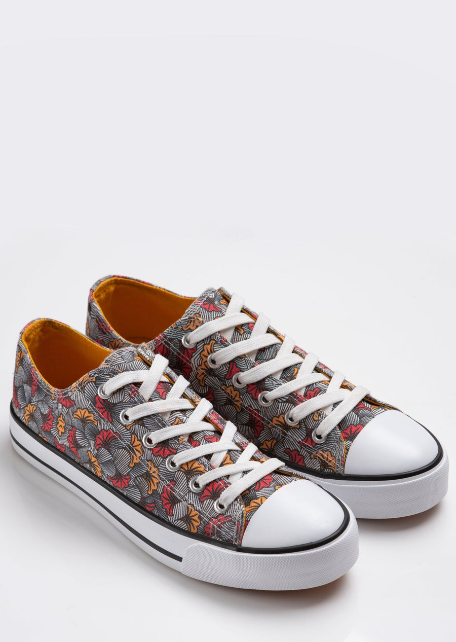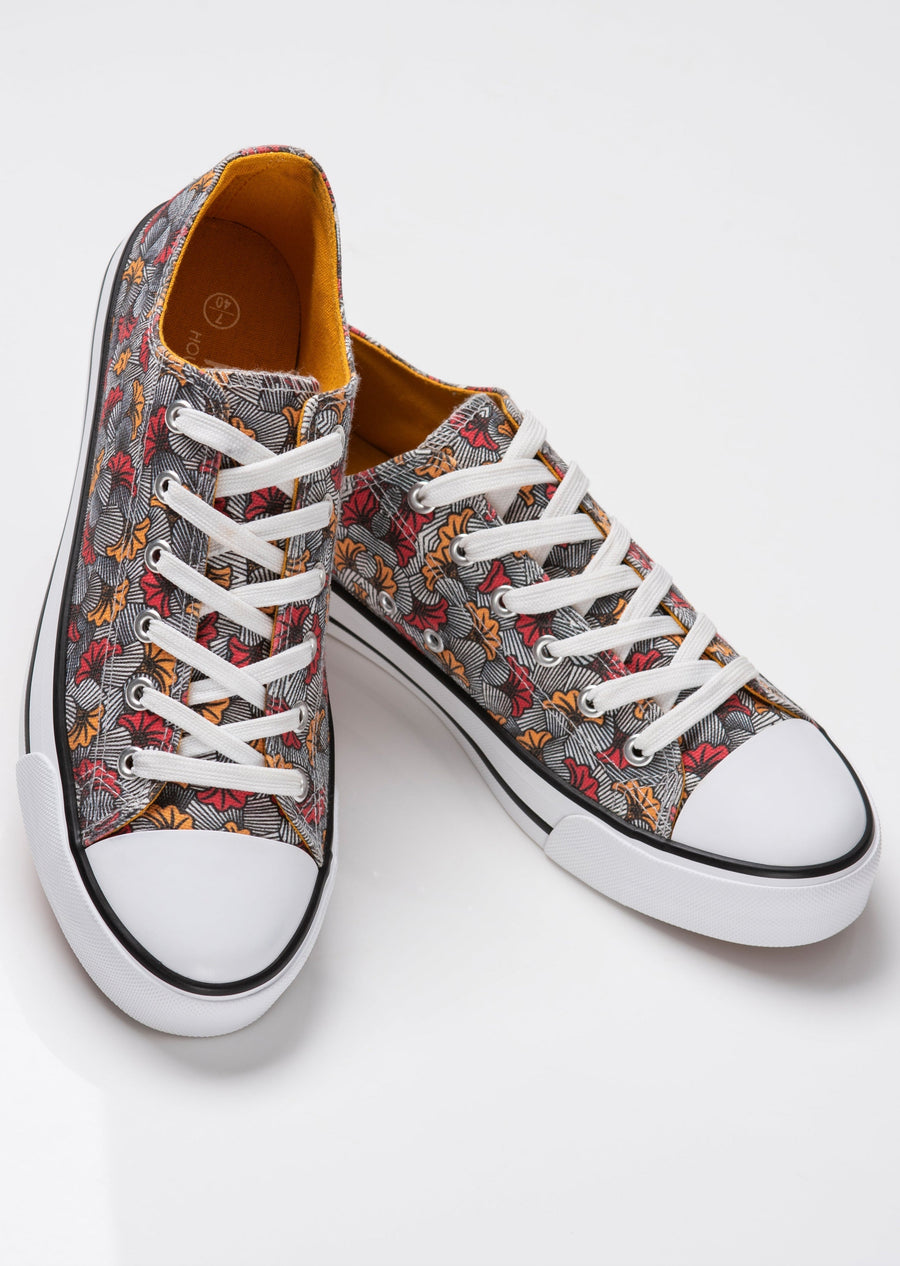 This canvas sneaker is a unisex shoe with an African pattern. It is a low top shoe. Perfect for casual style, suitable for walking, sports, skateboarding. Comes with white laces and a light rubber sole.