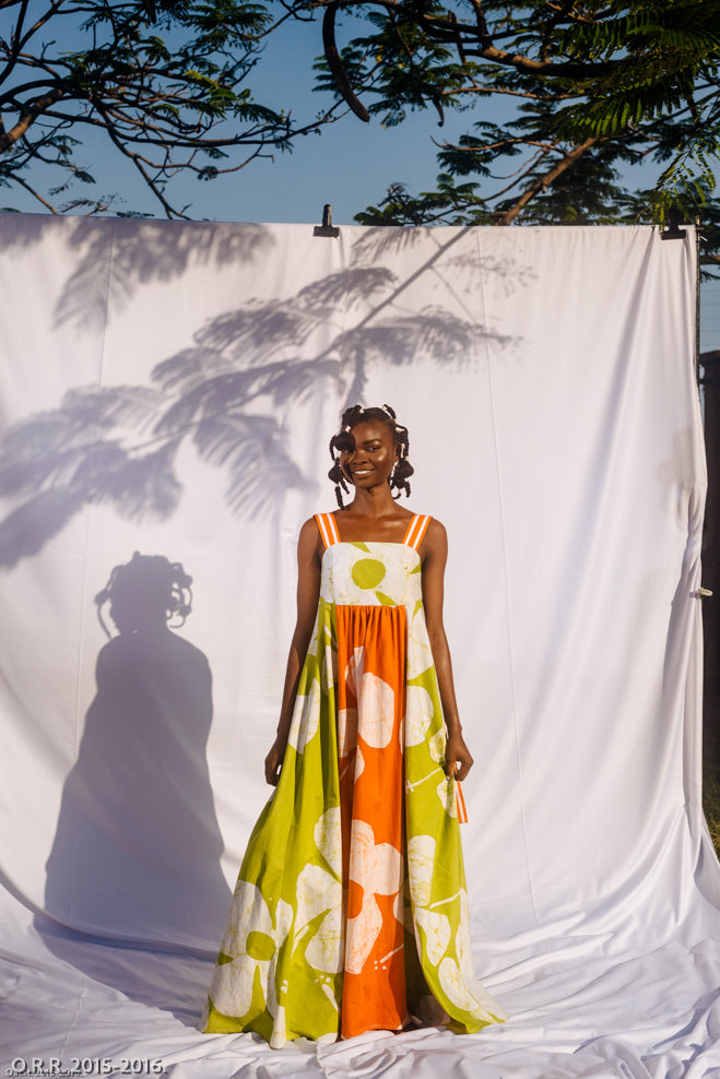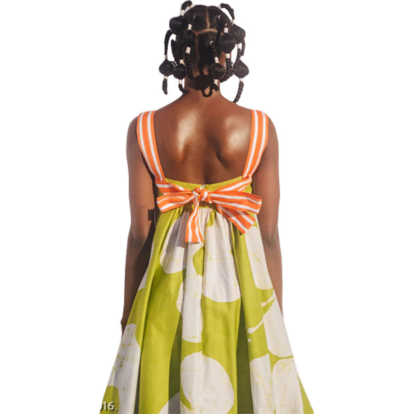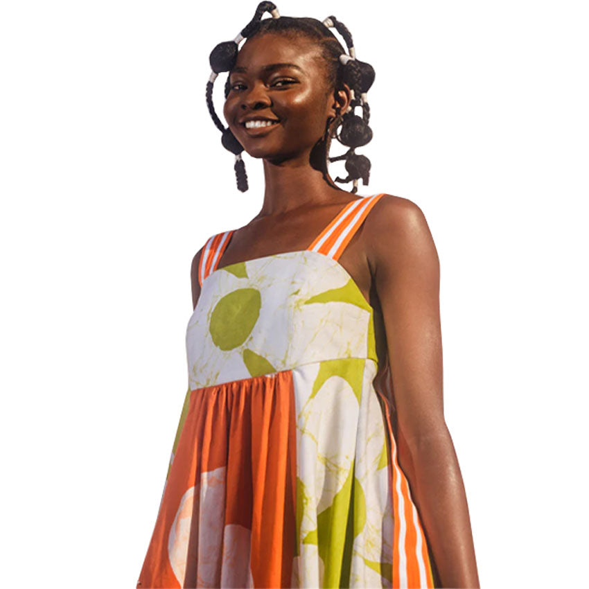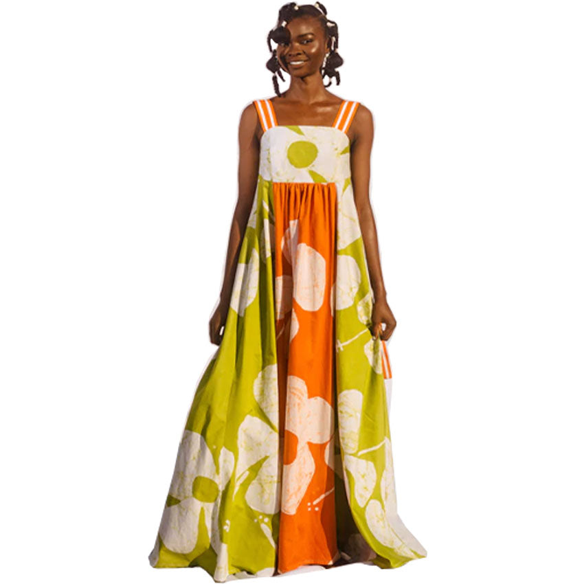 Enter the dynamic world of Aga Culture, a Lagos-based African design and culture brand. Embracing a fresh interpretation of African minimalism, the Arike Multicoloured Floral Maxi Panel Dress is a full-length panel dress adorned with deep pockets and a multitude of colorful straps. This Arike dress, showcasing vibrant hues of orange and green, features a captivating hibiscus shape from the Aada collection and is hand-dyed using locally sourced cotton.