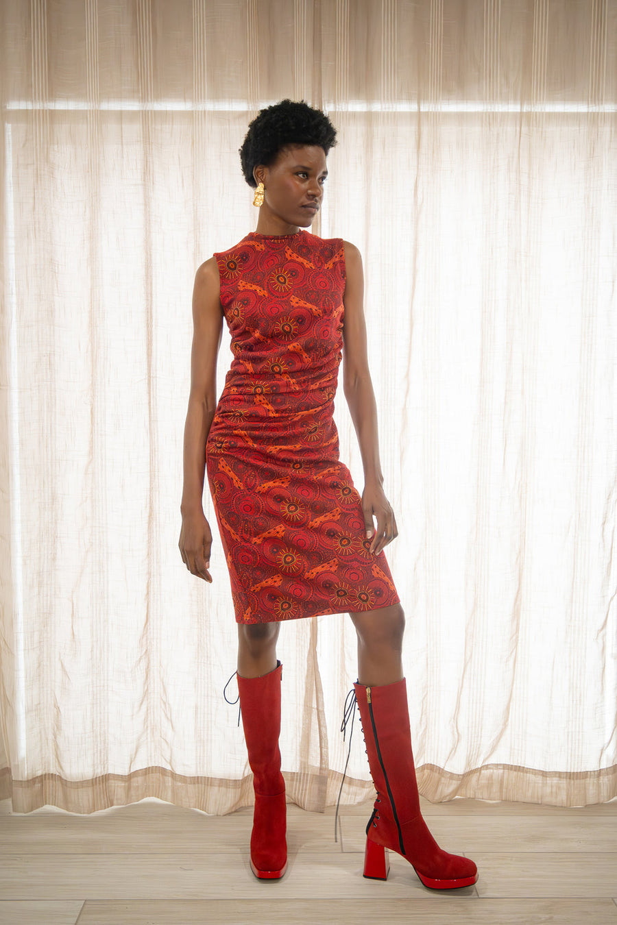 The Sao Tome Dress is a versatile piece that effortlessly transitions from day to night. Adorned with a beautiful ruched front, this sleeveless style boasts a mock neck and is crafted from premium custom knit jacquard fabric in a luxurious shade of red.